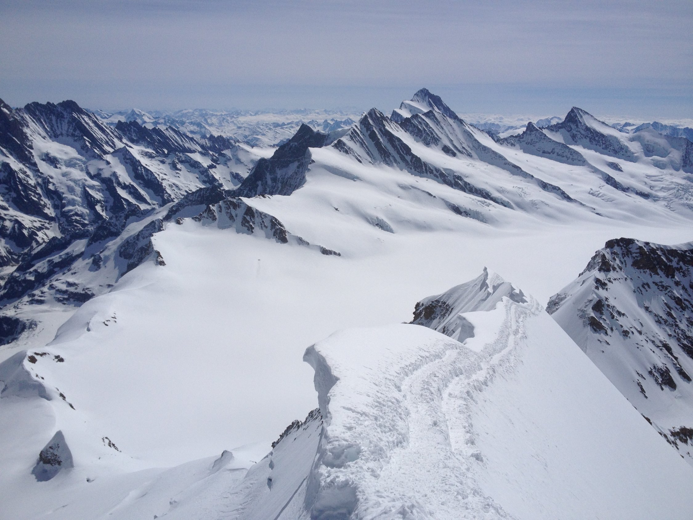 Mit der ersten Bahn aufs Jungfraujoch (9 Uhr), 10:45 am Gipfel, dann weiter über die Grünhornlücke zur Finsteraarhornhütte. Trotz Start um 9 Uhr und hoher Nullgradgrenze, keine störende Erwärmung im Auf- oder Abstieg zum Mönch.