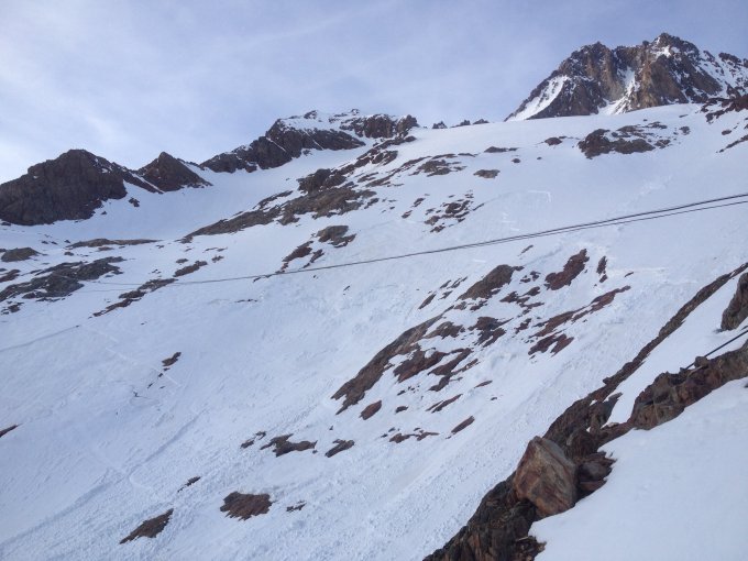 In der Abfahrt vom Frühstücksplatz Richtung Gemschlicke traversiert, Ski aufgebunden und weiter zur Oberaarjochhütte. Schnee in der Gemschlicke trotz W-Exposition und Wind um 12 Uhr feucht. In der Mitte kommen im oberen Teil langsam die Steine heraus. Bei warmen Temperaturen besser früher dran sein oder zur Oberaarjochhütte die Variante über den Galmigletscher wählen.