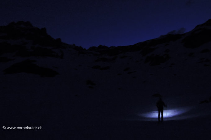 Das ist die Ausgangslage, trotzdem dass es fast Wolkenlos war konnte der Schnee natürlich nicht abstrahlen, nicht gefrieren beim Start weicher Schnee, wir hofften dass es weiter oben evtl besser abstrahlen konnte, nichts dergleichen, bis hinauf neben der Albert Heim Hütte alles weich. Ab hier eine Kruste die etwas angezogen hatt, darunter nasser Schnee. Wir entschieden uns weiter zu gehen bis zum Skidepot, nichts unversucht zu lassen. Im Anstieg zum SW-Couloir sind viele Lawinen Runsen zu überqueren, in diesem Kessel haben wir nach rechts ausgeholt um möglichst hoch zum Couloir hinein zu queren. Auch hier war der Schnee immer noch nicht tragend.