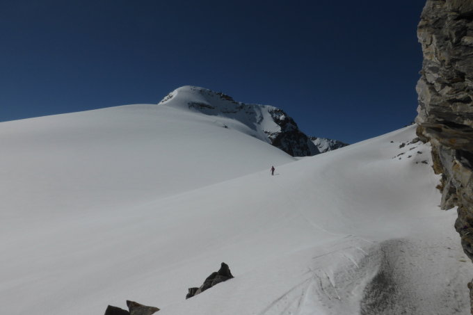 Leider kein Schnee mehr bis 2100 müM. Dann teils gefrorener Deckel, zeitweise auch eingesunken bis 2700. Zum Furggeltihorn hart, mit Harsteisen.