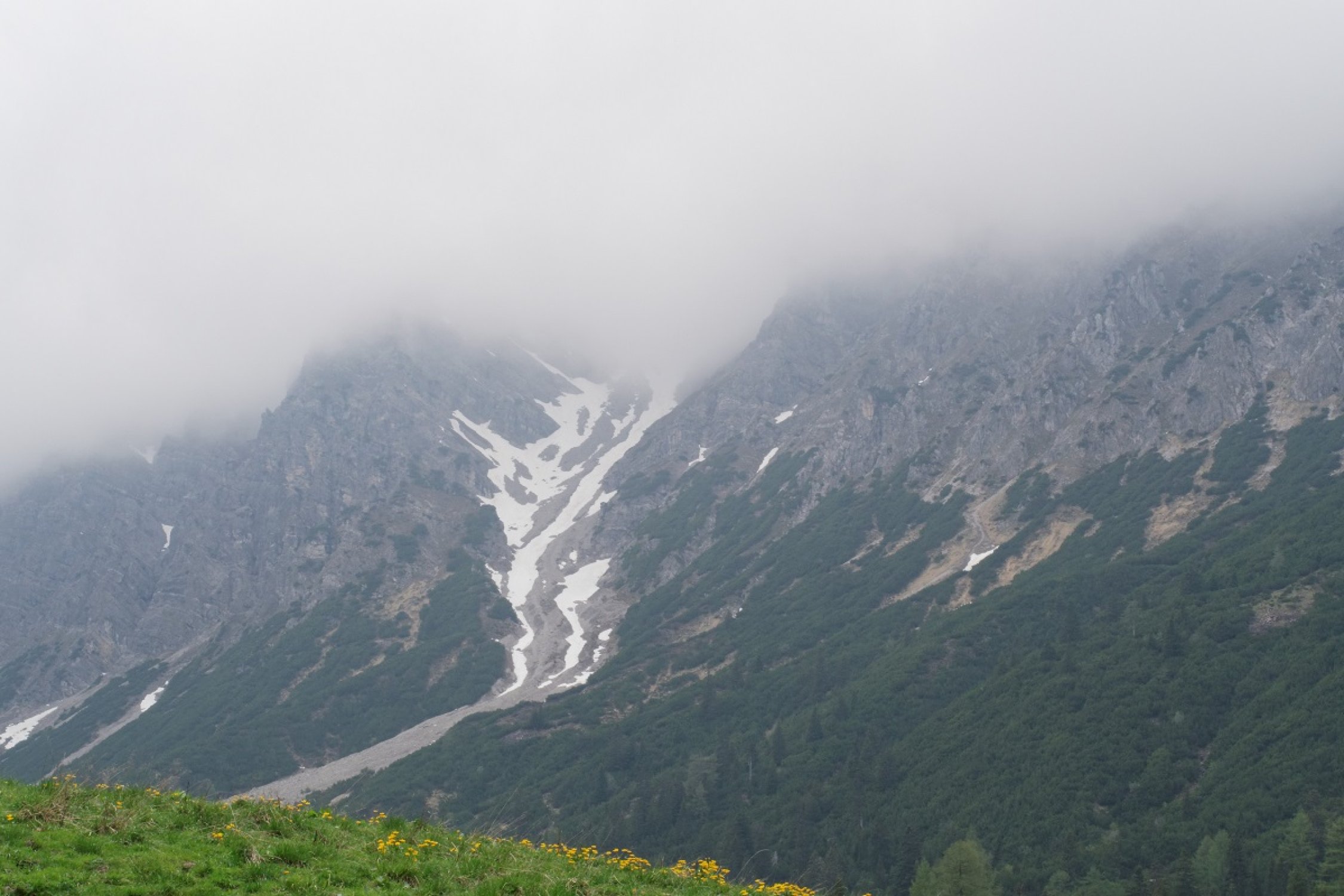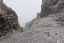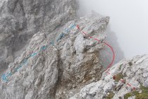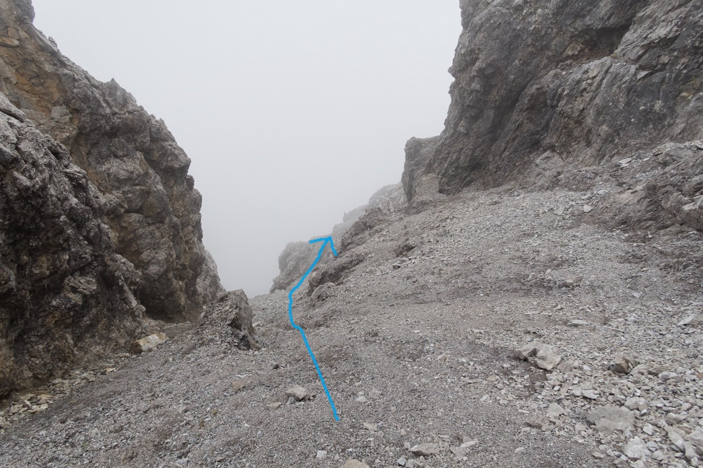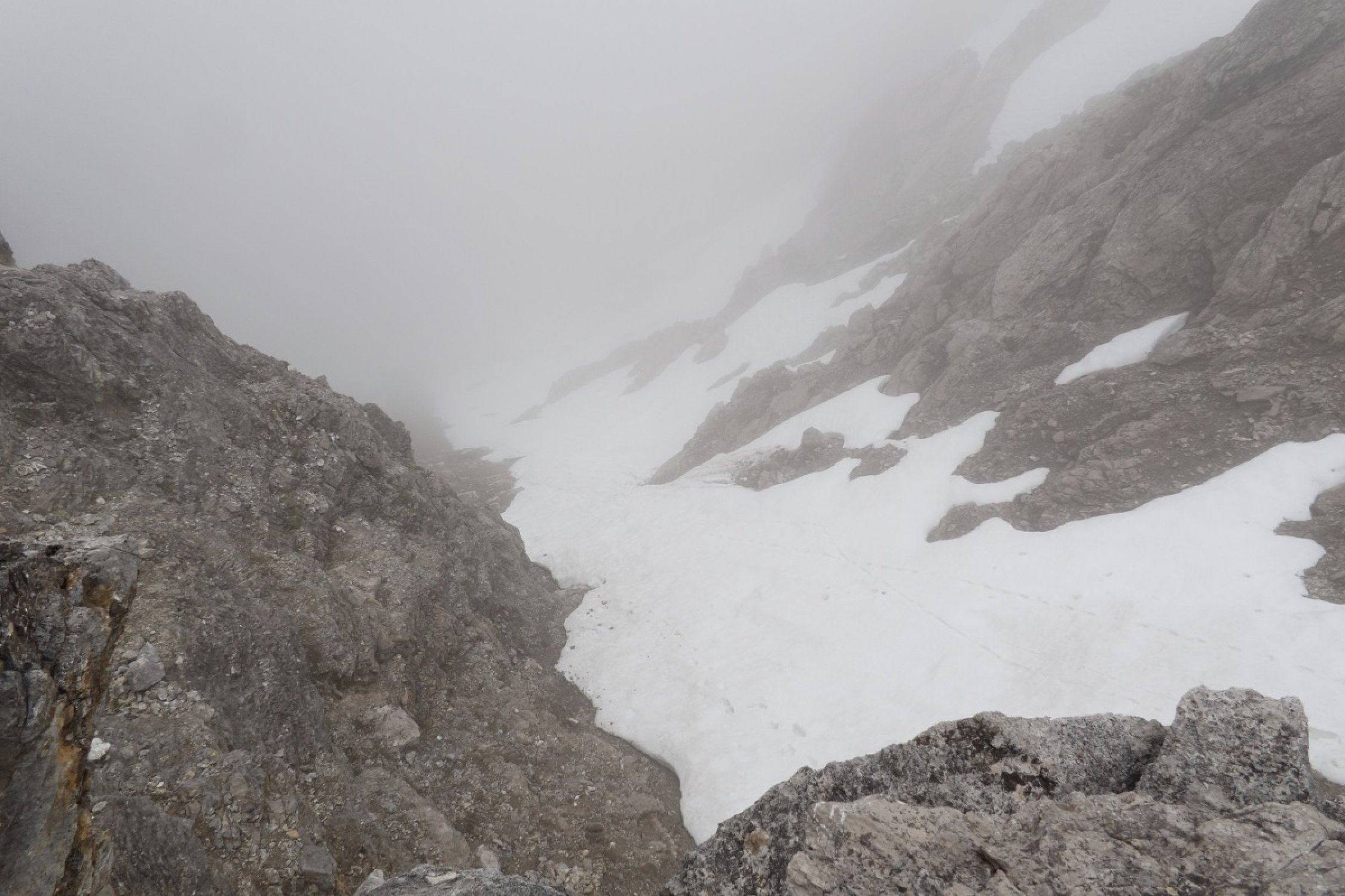Die Rinne war noch komplett mit Schnee gefüllt, was das Steigen enorm erleichterte - 10 cm fauler Schnee auf harter Unterlage. Die felsigen Passagen ab dem Joch waren trocken und sind nur dem geübten, absolut trittsichern und schwindelfreien Berggeher anzuraten. Aufgrund der guten Verhältnisse in der Rinne wurde diese dann im Abstieg in zehn Minuten abgerutscht; Garmaschen nicht vergessen :-)