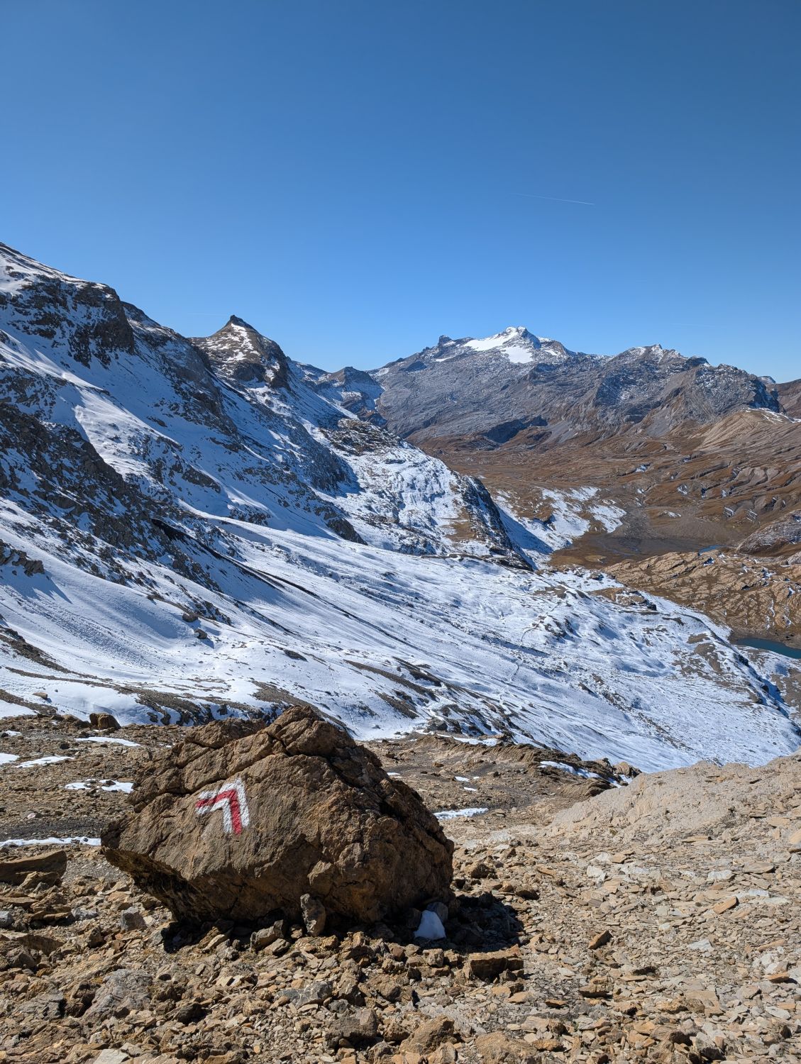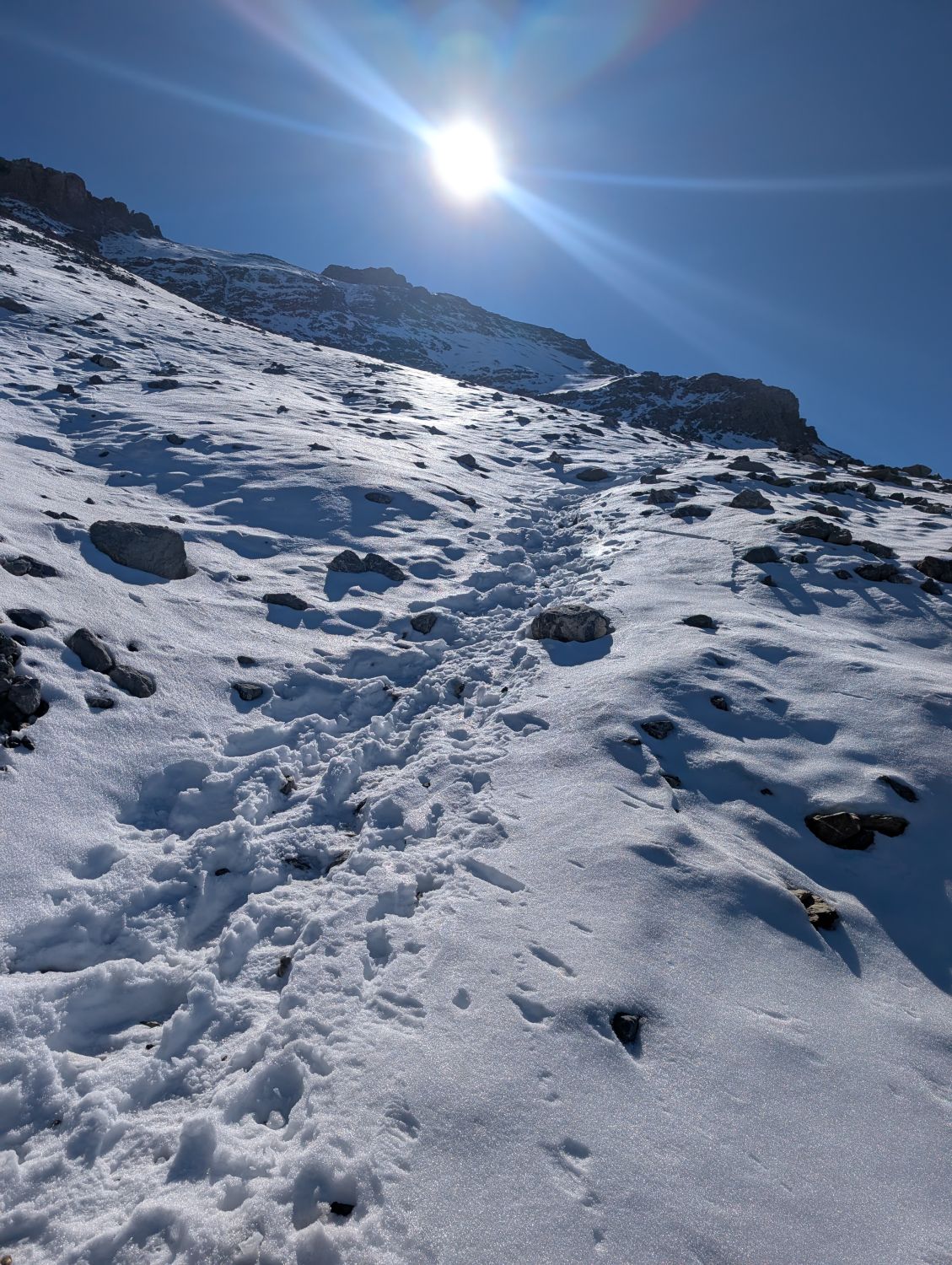 Wir sind von der Iffigenalp (1584 m) aufgestiegen. Der Weg war trocken bis zu den Rawilseeleni. Nach dem See lag noch etwas Schnee auf dem Weg, bis etwa zur Umleitung auf ca. 2555 m. Schuhketten sind aber nicht nötig. Der Weg bleibt noch gut markiert und leicht zu finden.