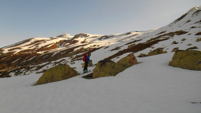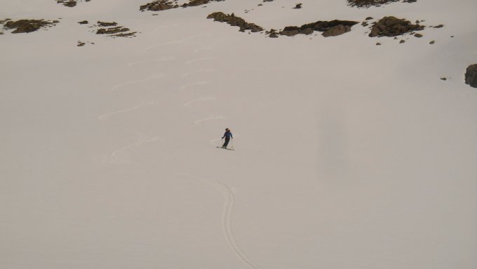 Klein, aber fein. Ab Wägerhus bis auf eine kurze Graspassage ausreichend Schnee für Aufstieg und Abfahrt. Morgens gut durchgefroren, Harscheisen erforderlich. Abfahrt perfekter Firn von oben bis unten (11.30 h, überwiegend westexponiert). Kurzes Gratstück mit Steigeisen begangen, da teilw. hart und etwas ausgesetzt.