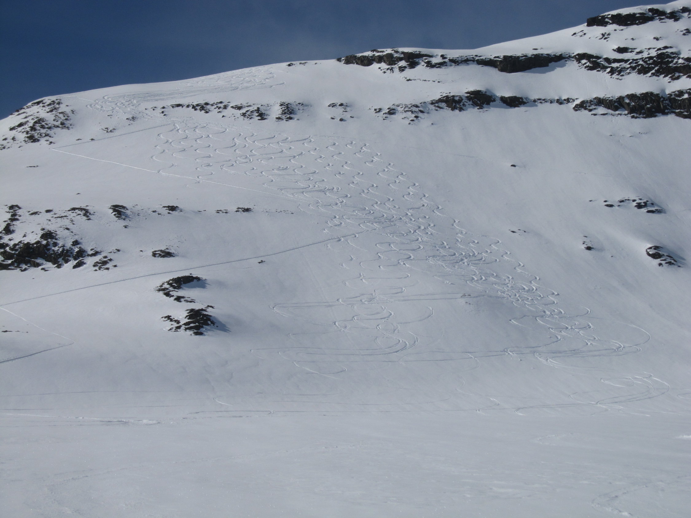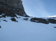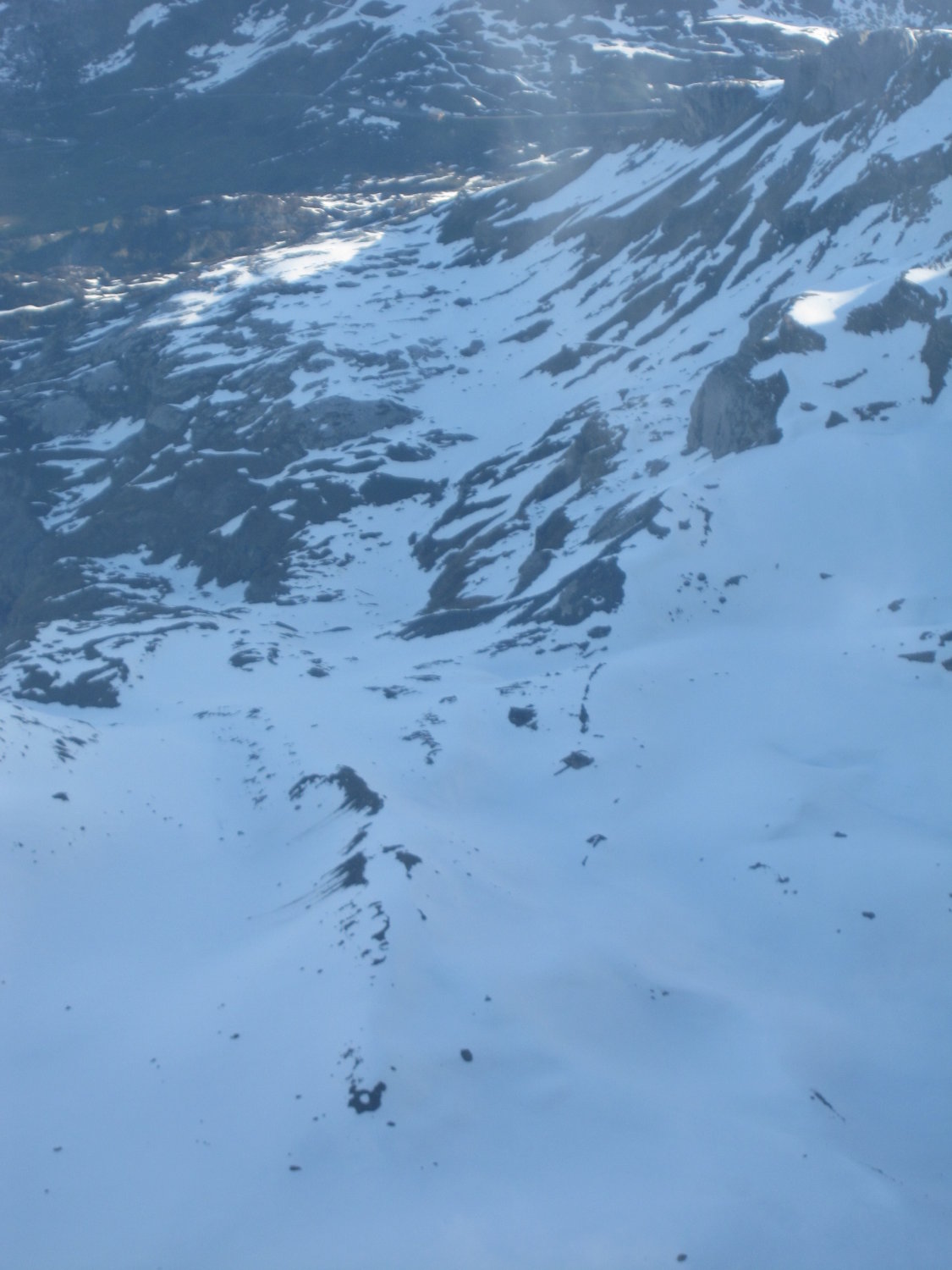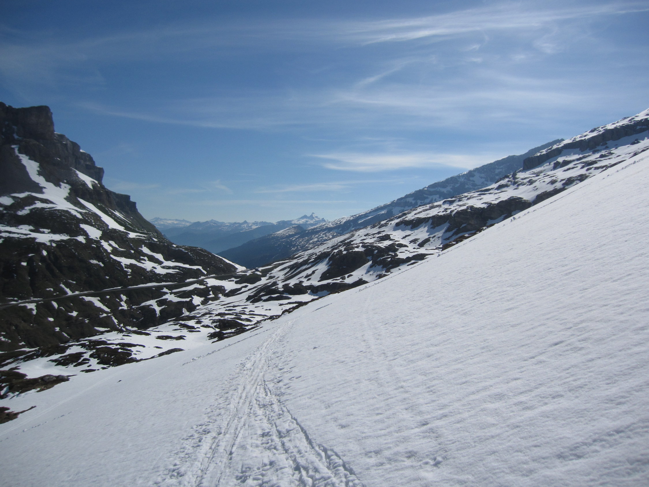 Erstes Stück der Abfahrt um 8 schon leicht aufgefirnt. Dann in die Nordflanke Richtung Chammlilücke gequert. Dort sogar noch ein paar Schwünge Powder angetroffen. Und das Mitte Mai!!!