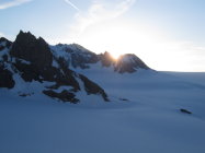 bei Start um 5 an der Planurahütte 0°, leichter Wind und pickelhart gefrorene Oberfläche. Die Schwünge hinab auf den Hüfifirn somit wie eine frisch gebahnte Piste am frühen morgen.