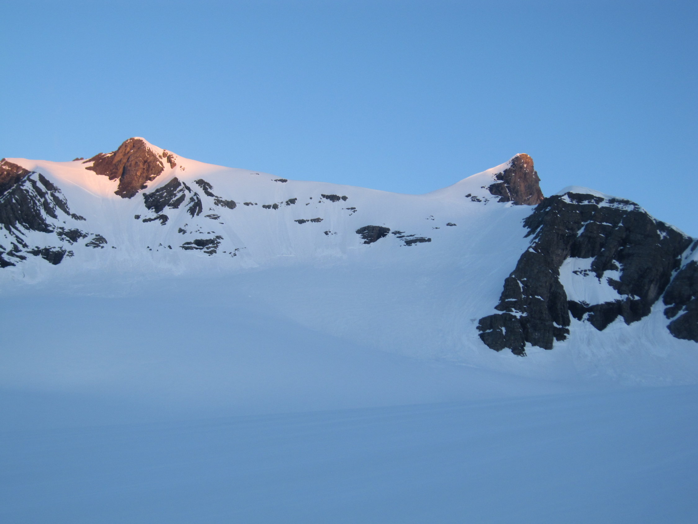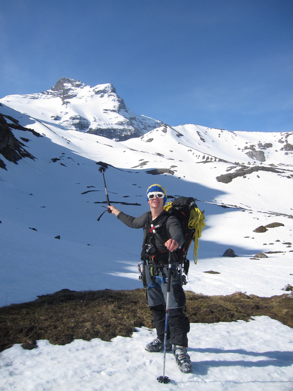 Steilhang zum Skidepot auch gut durchgefroren, dank alter Spur und mit Harscheisen aber ohne Probleme machbar. Um kurz vor 8 auf dem Gipfel.