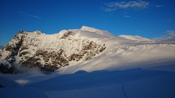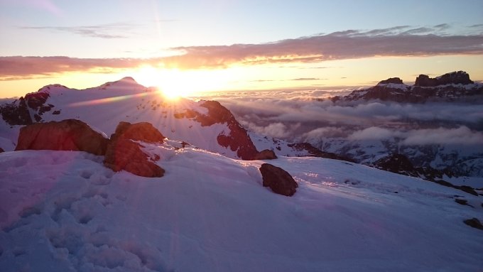 Schöne Abendstimmung. Am Samstag zuerst auf das Gwächtenhorn und bei schöner Firnauflage wieder runter. Danach aufs Sustenhorn. Sehr gute Bedingungen, gut durchgefroren. Wir hatten zwar das Sustenhorn für uns allein, allerdings war die Abfahrt nur im Steilhang noch gut, weiter unten war es wegen des Neuschnees doch ziemlich anstrengend.