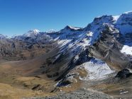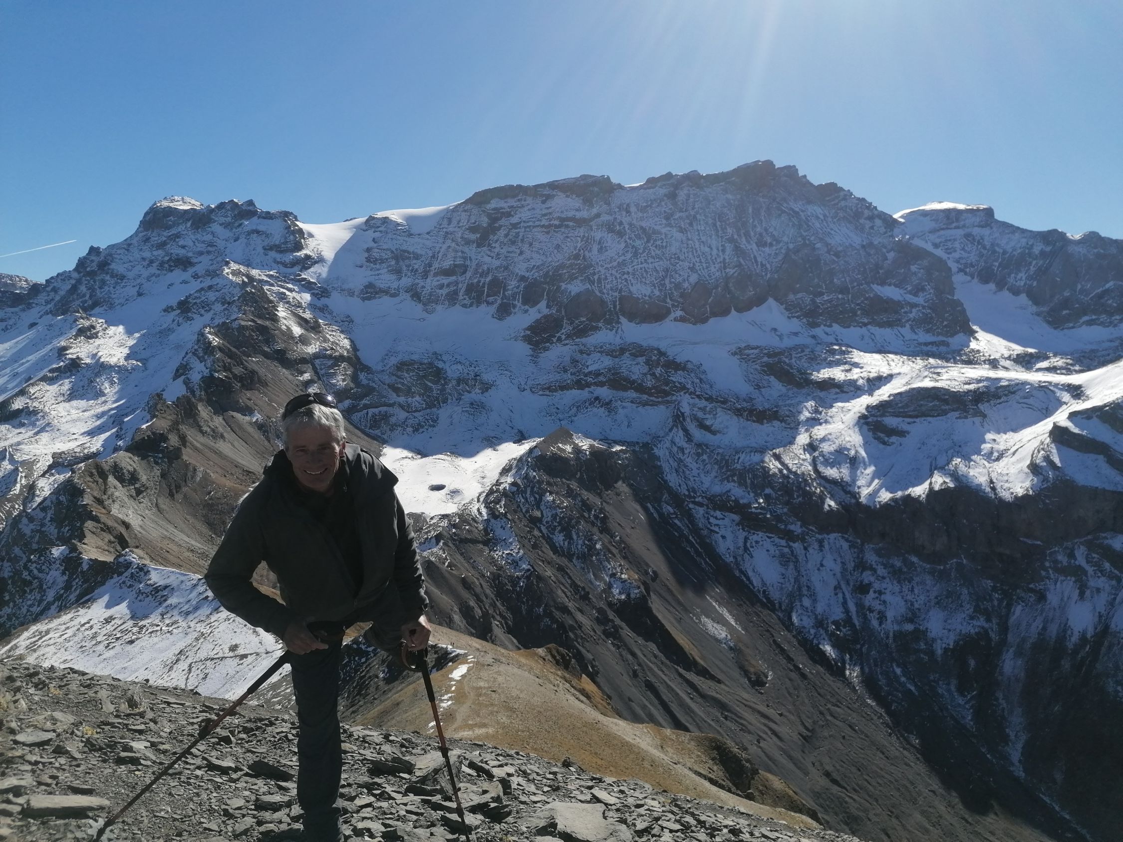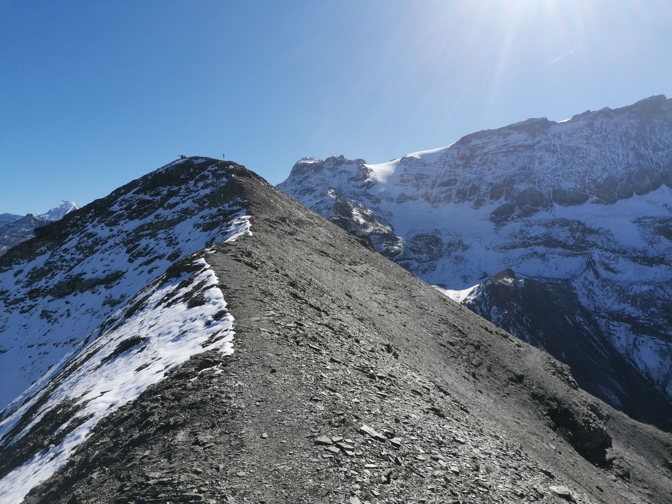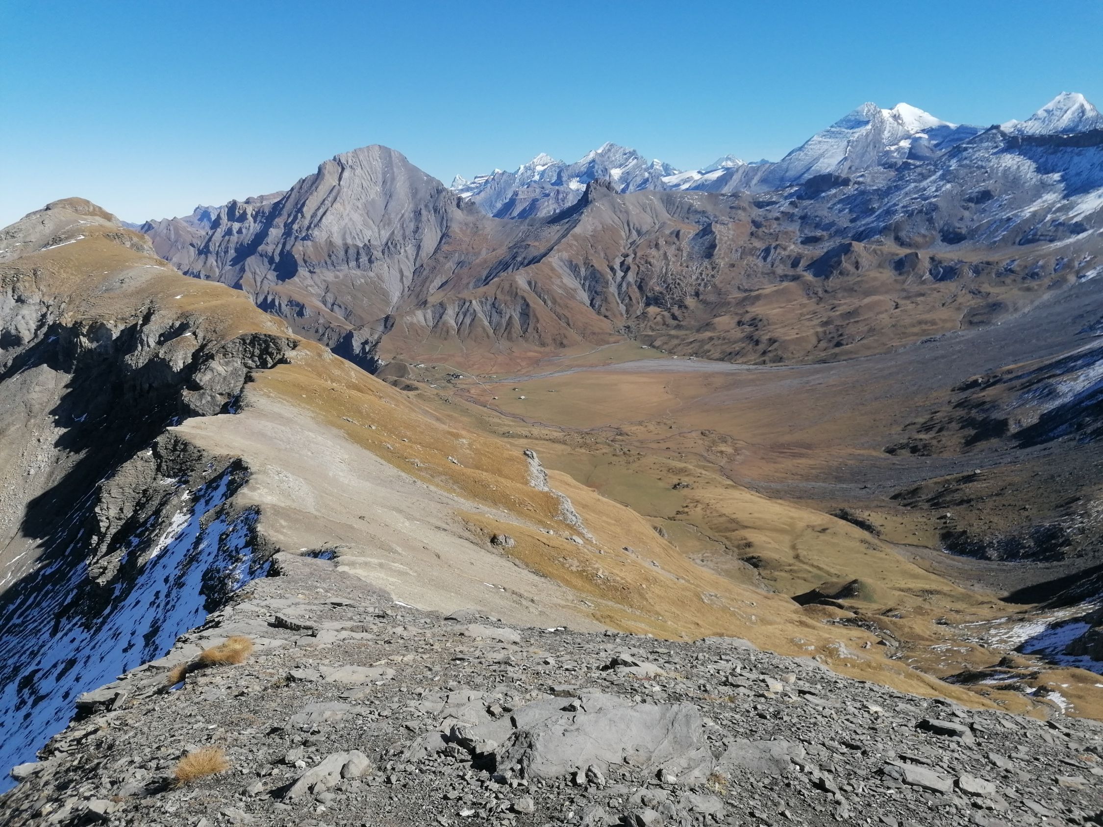 Das Panorama ist grandios. Es grüssen Eiger, Mönch, Jungfrau, Aletsch-, Balm- und Rinderhorn. Zum Greifen nahe der lange Wildstrubel. Im Westen grüsst das Wildhorn, und Les Diablerets.