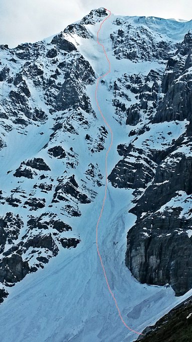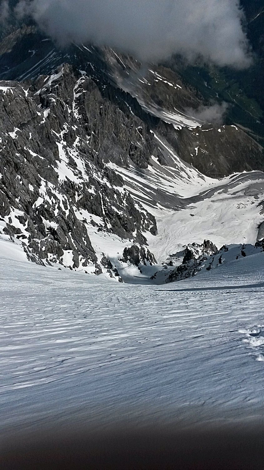 Wand: bis zur Gurgel viel Lawinenschnee, danach wechselnd Trittfirn und weicher Schnee bis zum ersten Eiswulst. Dieser blank und etwas brüchig.