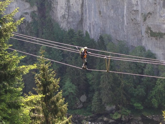 Wunderschöner, sehr gut erschlossener und abgesicherter Klettersteig (K4, ca. 2 Stunden) an der Schweiz/Französischen Grenze. Dank der Südlage war es schon am Vormittag schön warm in der Wand. Der Klettersteig erfordert etwas Kraft, da zum Teil leicht überhängend. Die Mindestgrösse ist 1.50m. Meine Tochter ist so gross und hat den Steig gut gemeistert. Es lohnt sich am Morgen rechtzeitig zu kommen, da der Klettersteig gut frequentiert ist. Es hat immer wieder Aufstiegsstellen. Am Schluss gibt es eine fakultative Tyrolienne (muss mitgebracht werden).