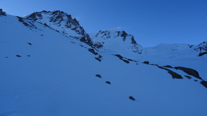 Ski tragen bis zur Chabod Hütte. Winterraum top. Am Wochenende offen (bitte Hütten-Homepage prüfen oder anrufen). Ab Hütte durchgehend Schnee. Sehr kalt mit viel Wind. Gletscher sehr hart und die Abfahrt kein Vergnügen mit besten Bruchharsch!