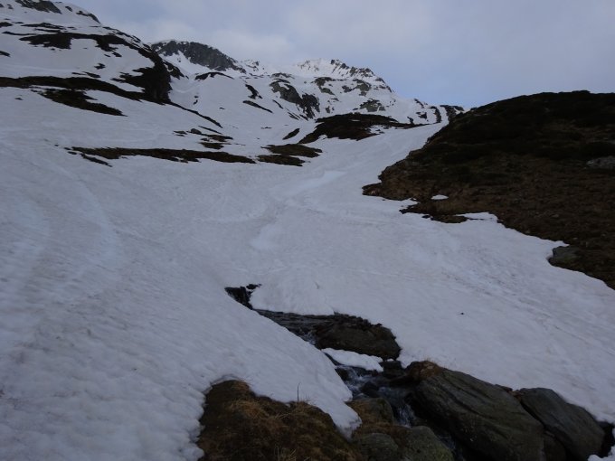 Es hat noch genug Schnee; nach 50 Metern kann man anschnallen. Die Verhältnisse waren nicht so grossartig wie erwartet. In der Gipfelregion ist man - einmal mehr - in den Nebel gekommen. Bei der Abfahrt wäre der Schnee bis zum Lattenhorn gut gewesen, aber da musste man sich ziemlich auf das Finden der richtigen Route konzentrieren. Nachher hat man zwar etwas gesehen, aber die schönen Hänge waren kurz nach 11 Uhr bereits ziemlich tiefgründig. Jetzt gibt es halt eine Spur zweifelhafter Güte mehr...