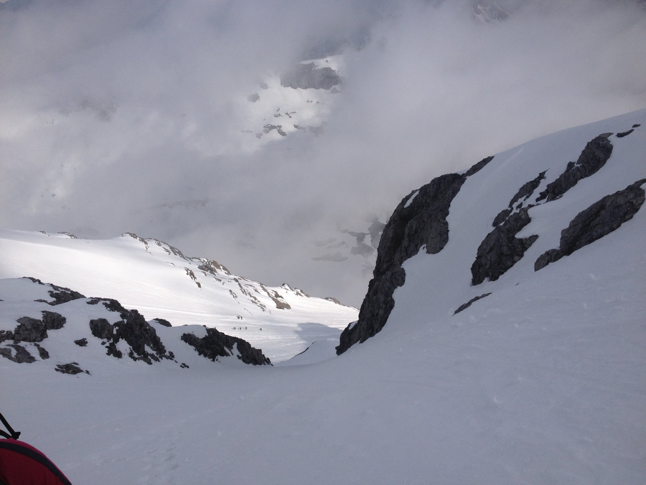 Da wir anfänglich die Pole Position innehatten, war die Querung nicht ganz trivial, alte Spuren waren nicht ersichtlich und der Schnee in der Querung war sehr weich, d.h. eine ziemliche Wühlerei. Ein Wegrutschen hätte bei dem weichen Schnee auch nicht durch den Pickel gehalten werden können.