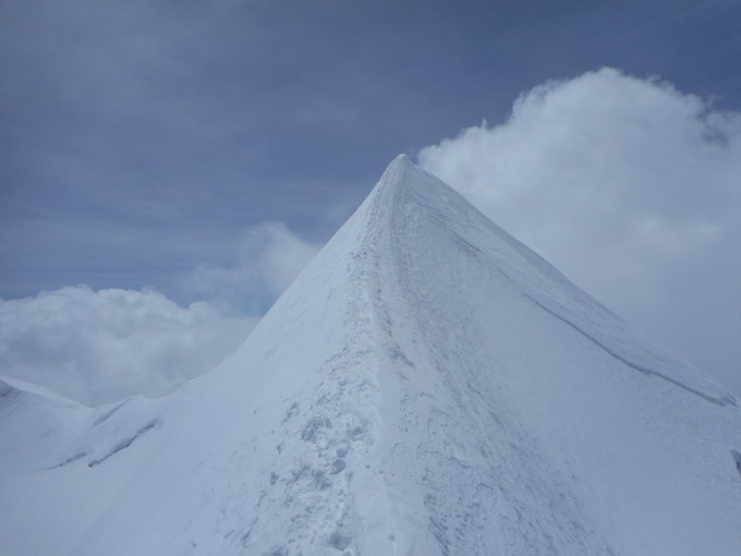 Gipfelgrat sehr exponiert. Es hatte eine grissige körnige Schicht Feinschnee auf Eis und Firn die nicht gehalten hat.