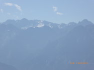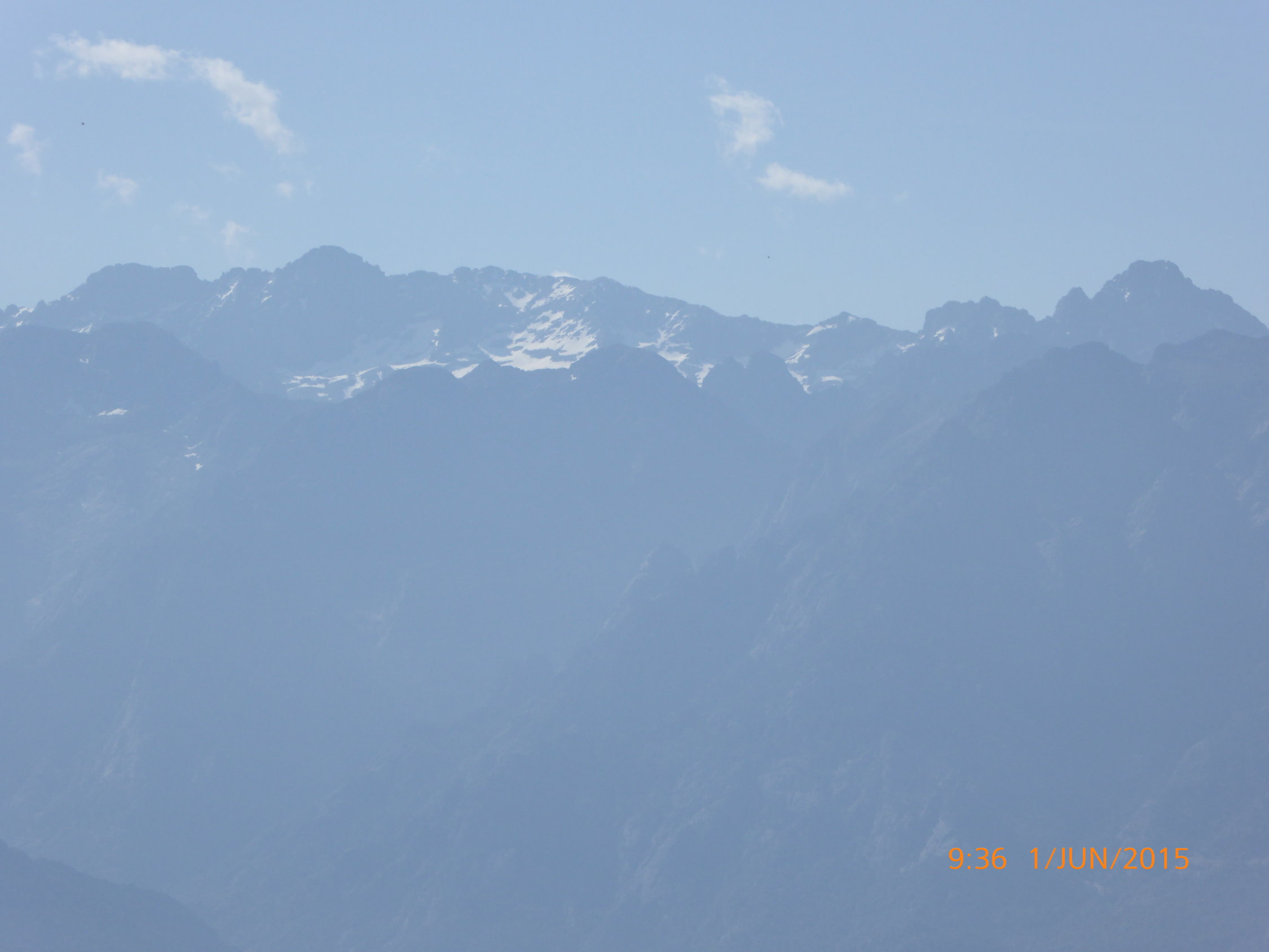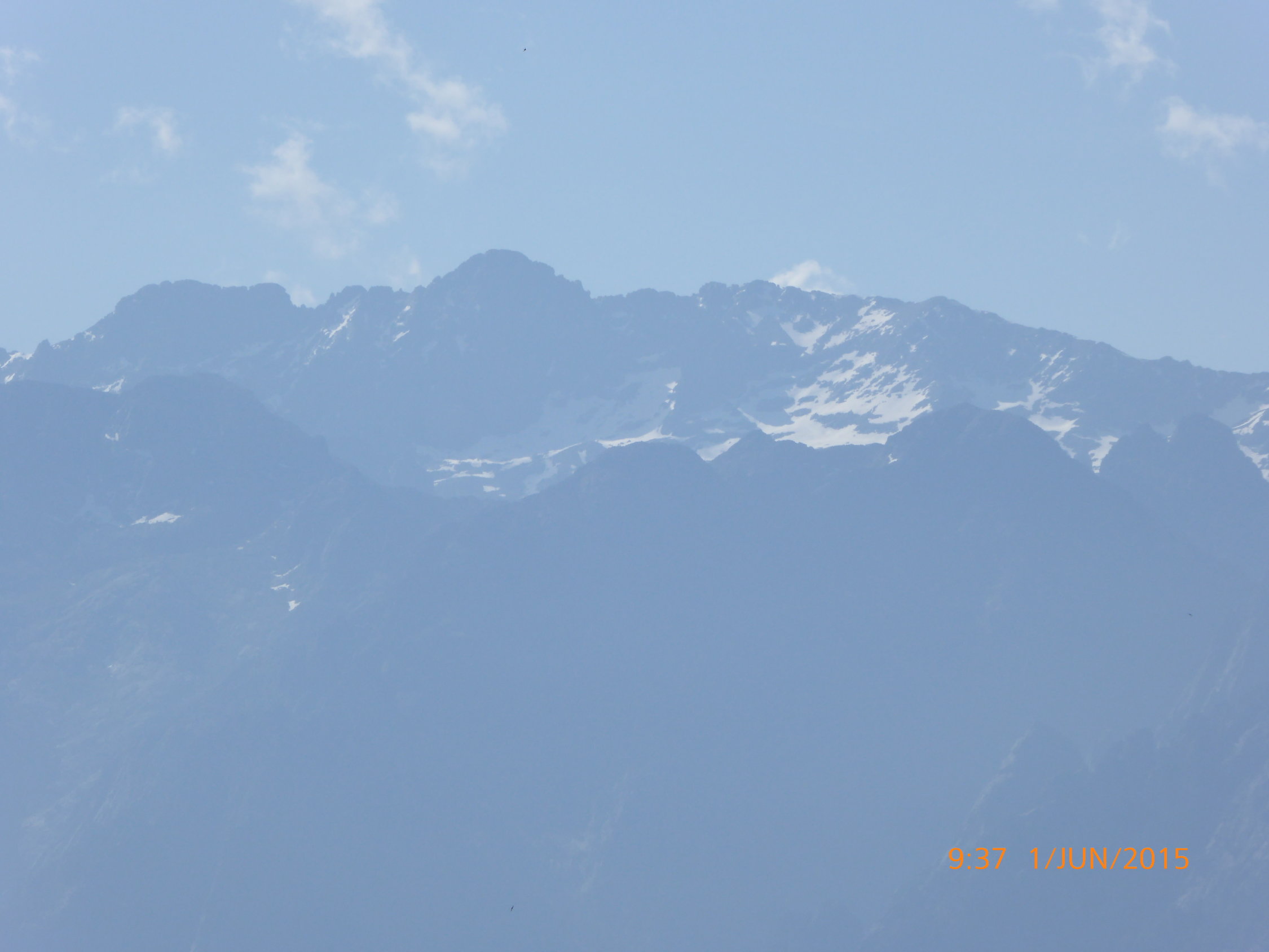 Schwülwarme Verhältnisse. Es hat um sieben Uhr in der Frühe bereits über 20° C. Am Gipfel um 9 Uhr gute Sicht trotz Dunst in den Niederungen. Ab 10 Uhr rascher Bewölkungsaufzug. Um 11 Uhr sind alle Berge am Hauptkamm in riesigen, gewittrigen Wolken verschwunden.