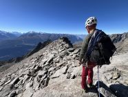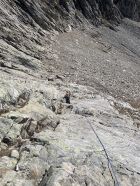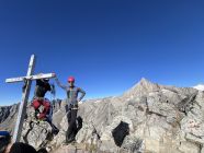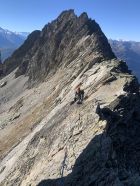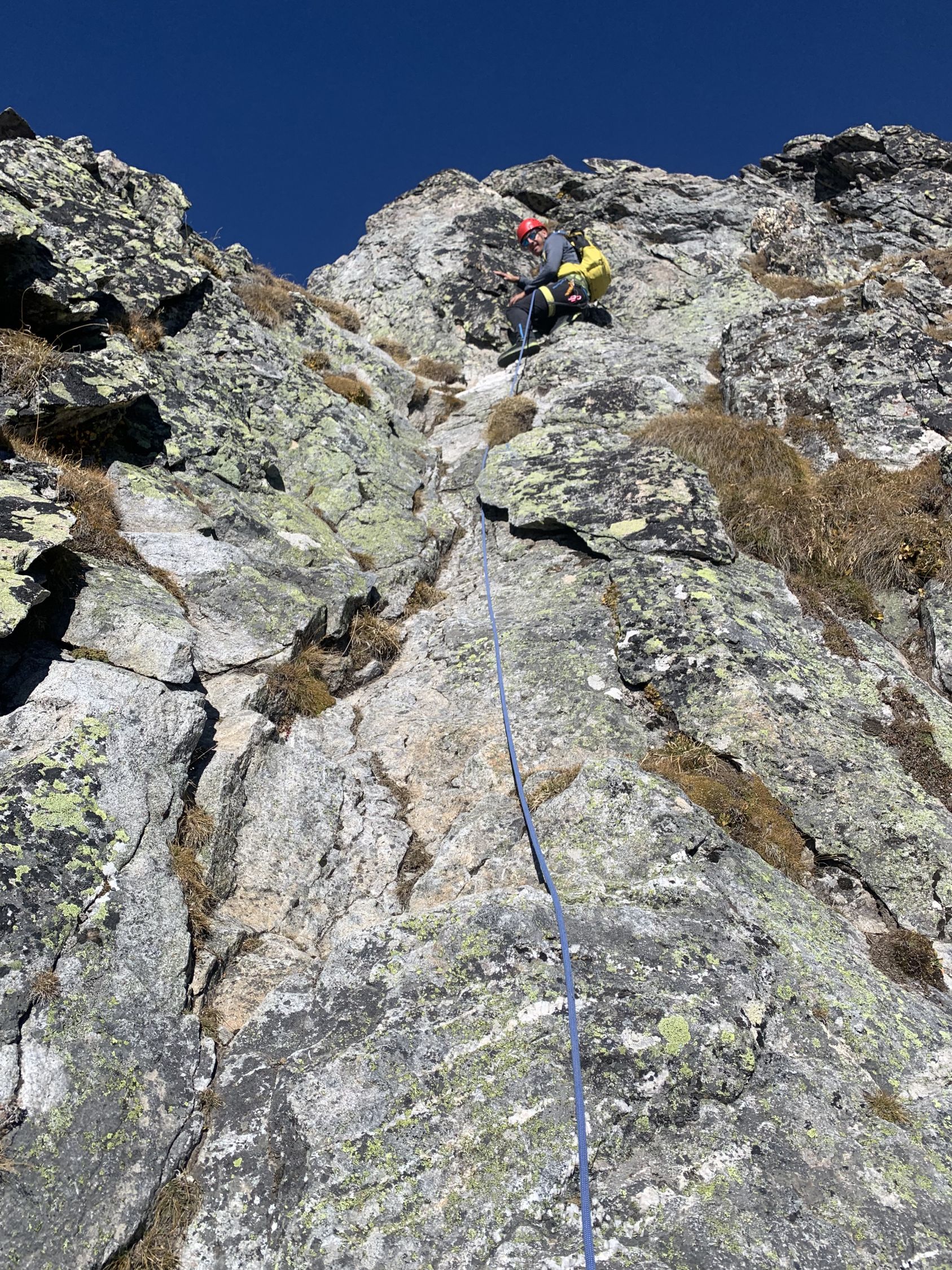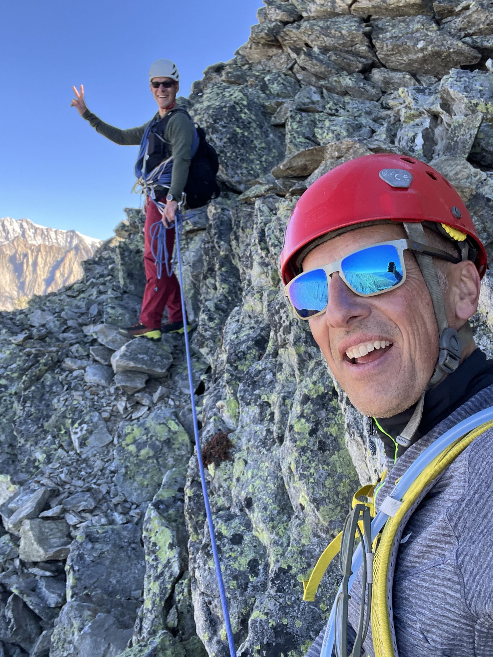 Tour mit meinem Kinsgi-Freund Alexander - 45 Jahre kennen wir uns nun. Null Vorkenntnisse, nie geklettert, trotzdem mit Bravour das Wiwannihorn bewältigt. Chapeau. Nicht schnell, dafür immer gut gelaunt und gut gesichert. Die Route ist dafür sehr dankbar. SW-Grat klettertechnisch nie schwierig (II+), Südwand mit Bohrhaken alle acht Meter, zudem gut mit blauen Punkten / Strichen markiert. Abseilen ist eigentlich nirgendwo erforderlich. Ein 30er Seil und fünf Express reichen sicher aus.