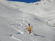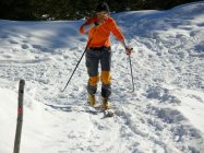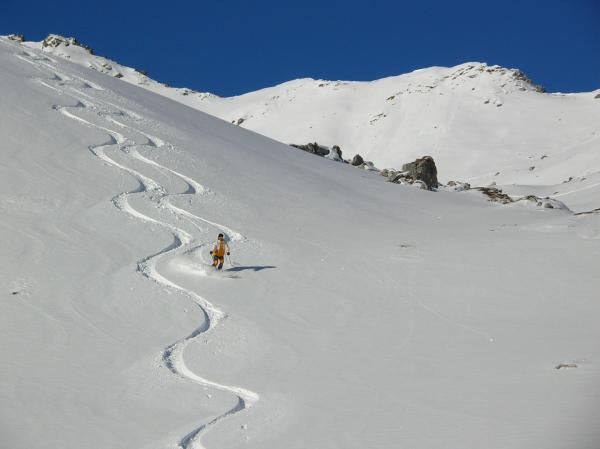 Zügige Aufstiegsspur. Dank Fussgänger und Schneeschuhläufer eine echte Herausforderung. Pulvrige Verhältnisse durchs Guggerbachtobel.