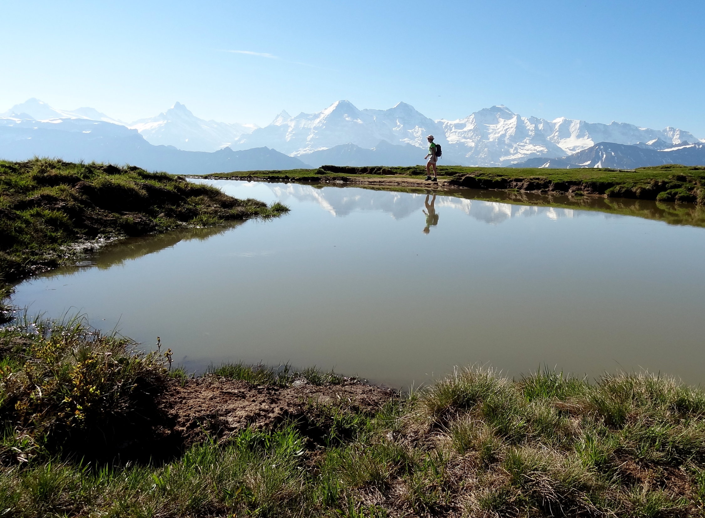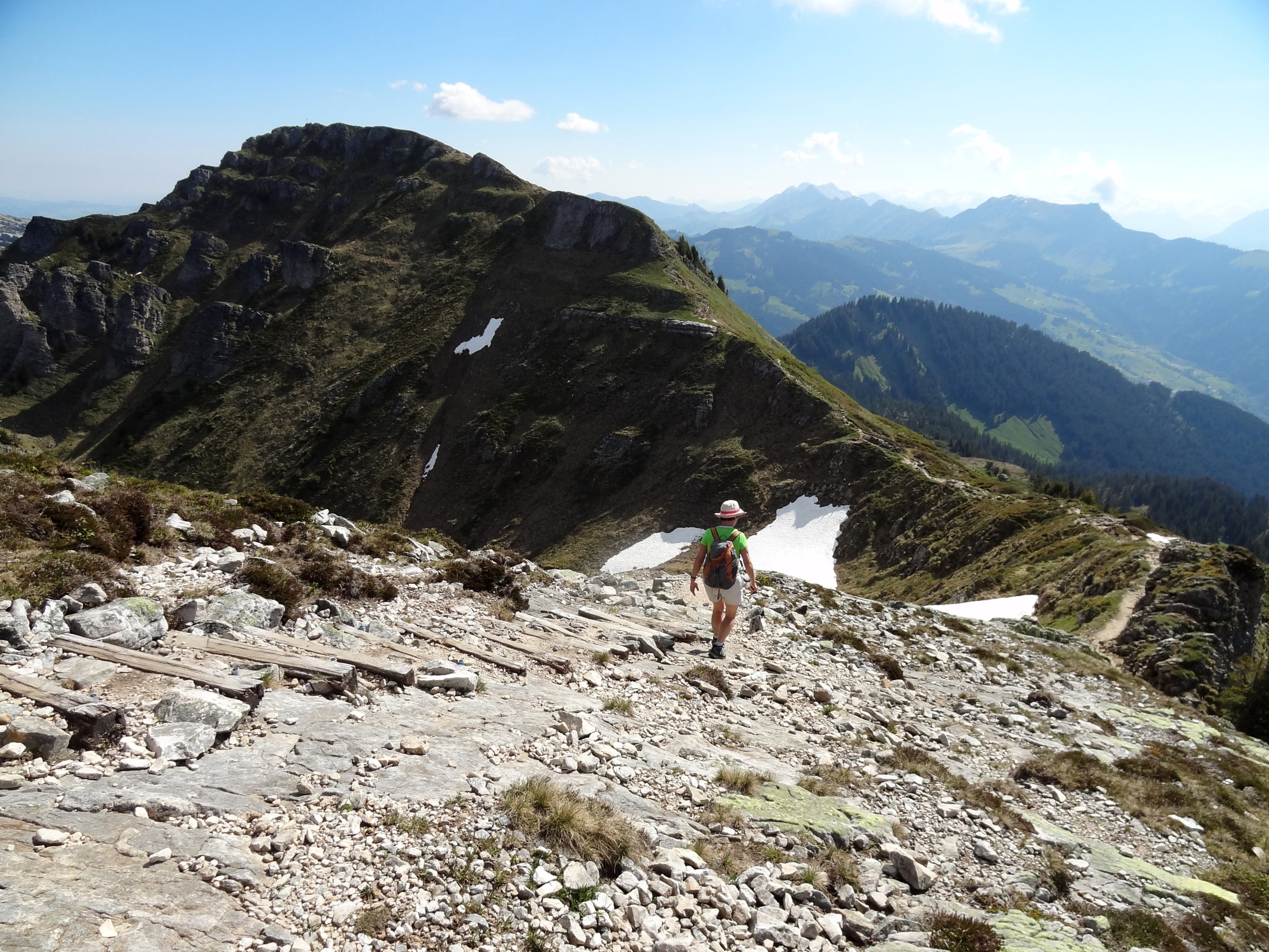 Der Schneehang im Abstieg vom Gemmenalphorn ist klein und am Wegschmelzen, hat man gute Schuhe und Stöcke, gibt es kein Problem.