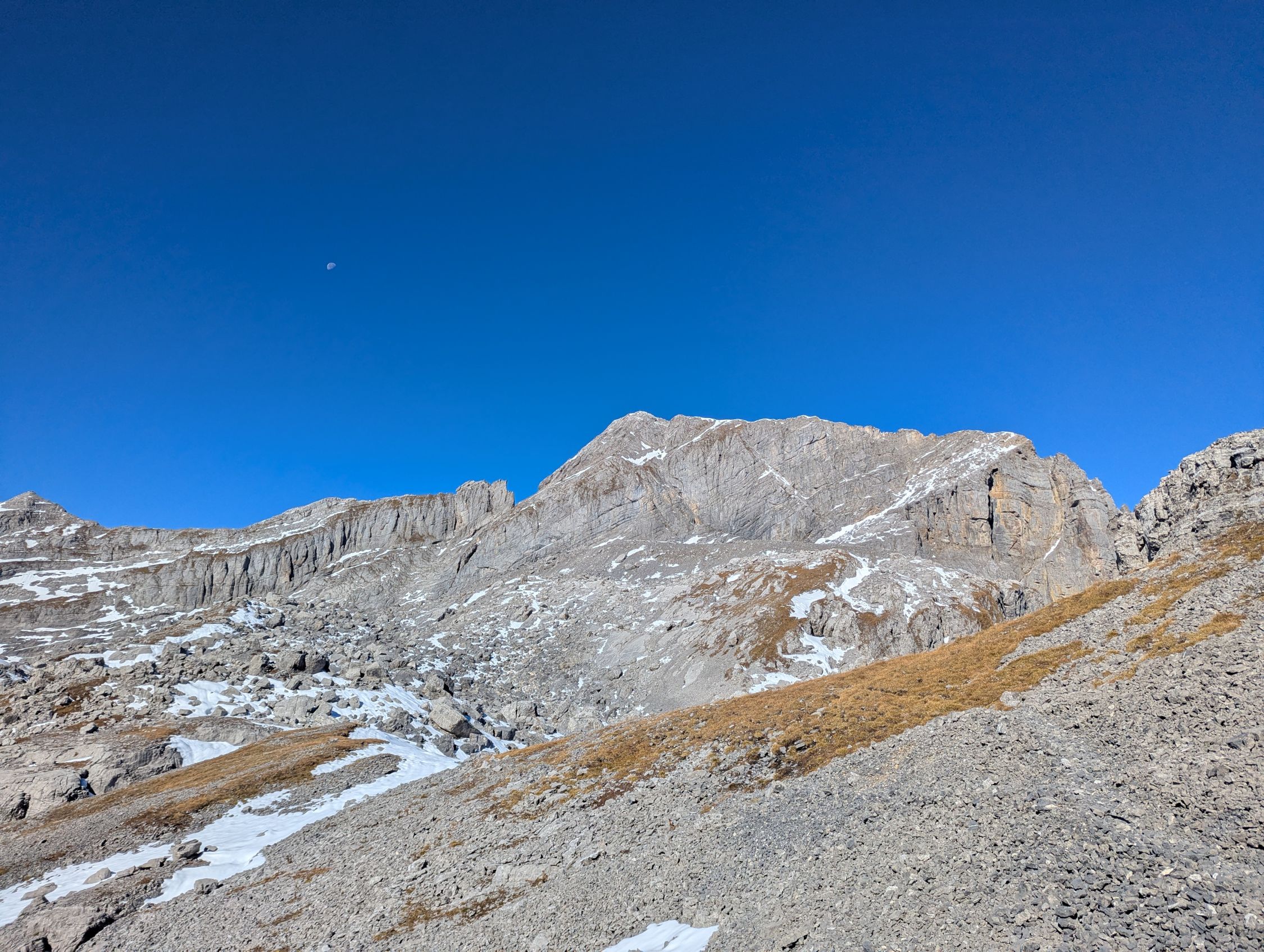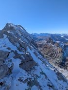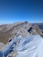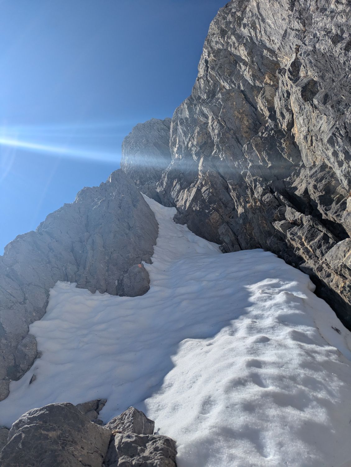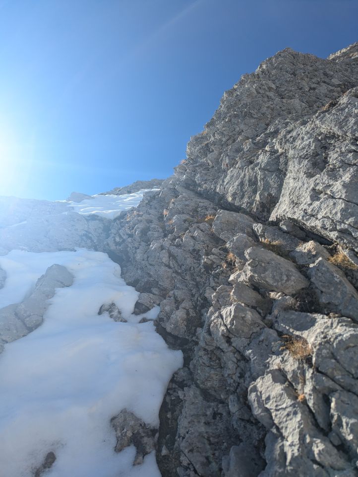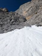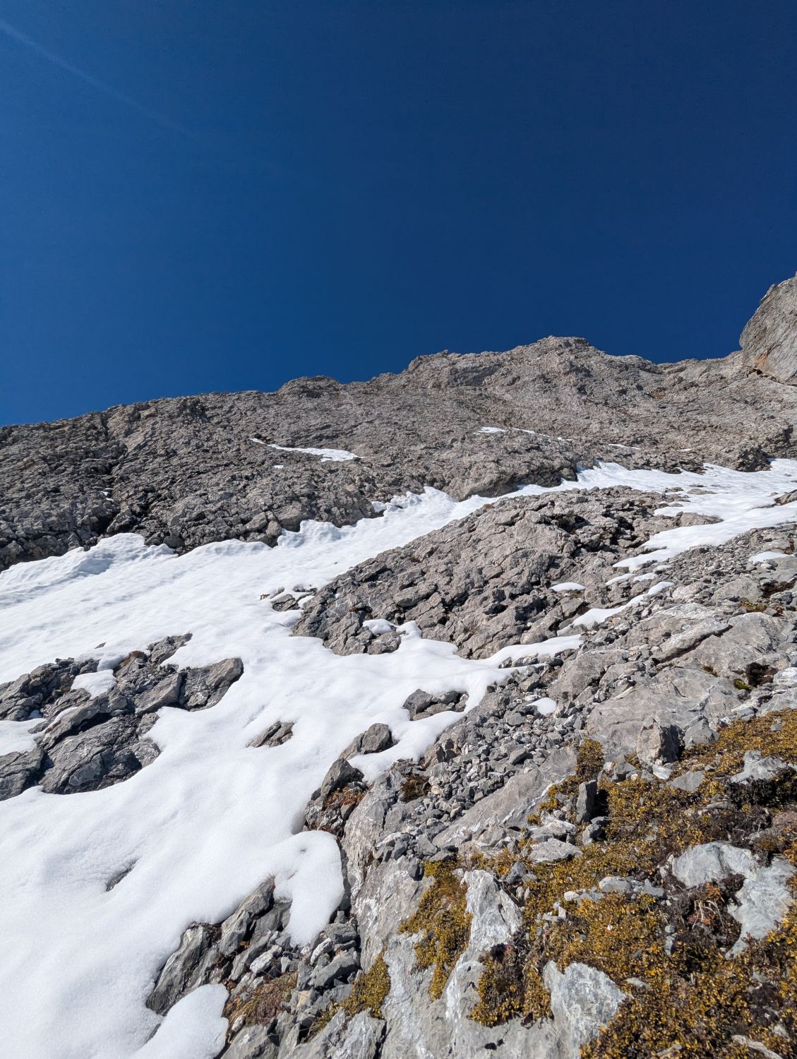 Immer wieder waren die Rinnen mit Schnee befüllt, so sich der Kamin. Mit etwas bedachter Routenwahl gut machbar. Neben dem Schnee noch der bekannte Brösel überall, wenn andere unterwegs sind eher heikel.