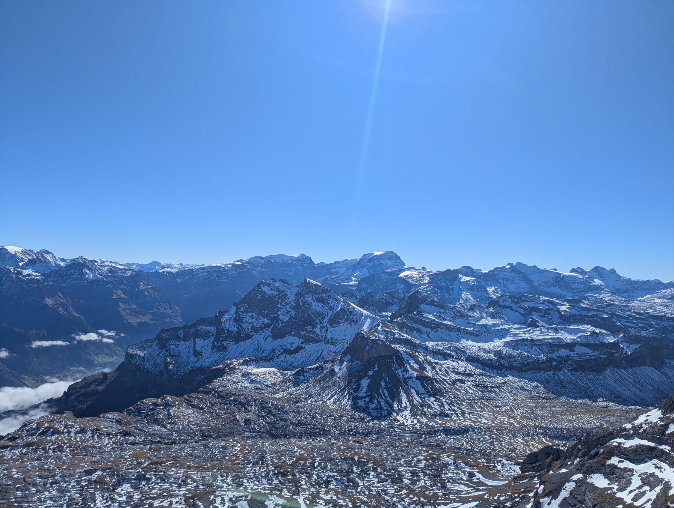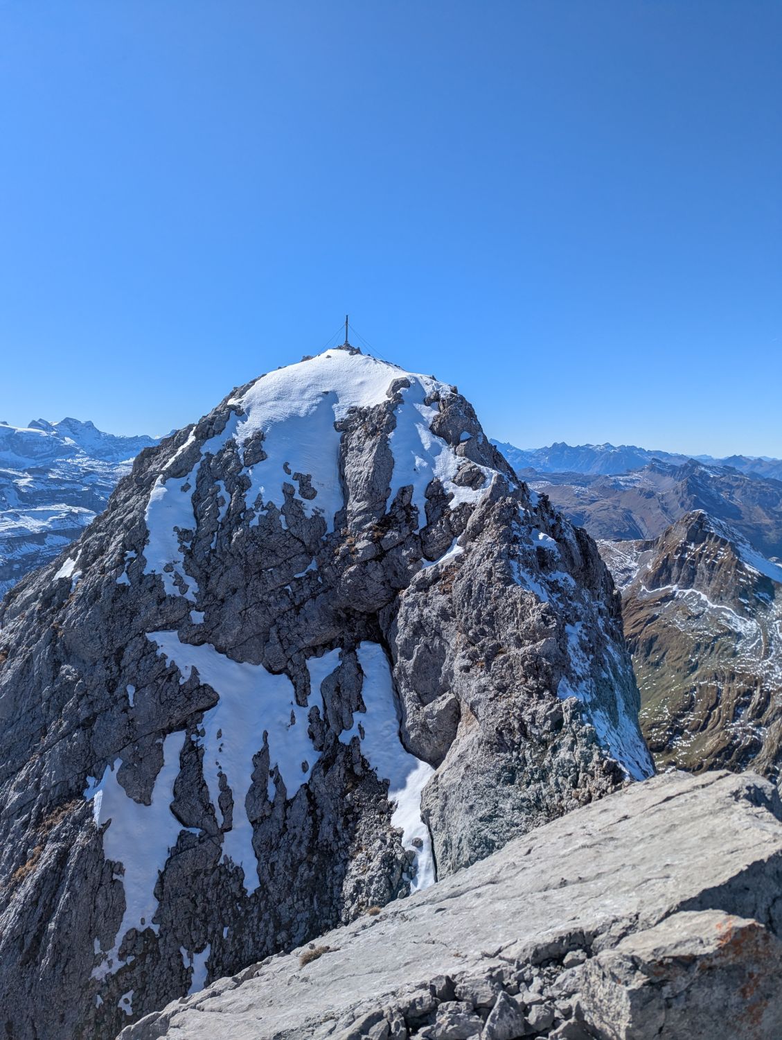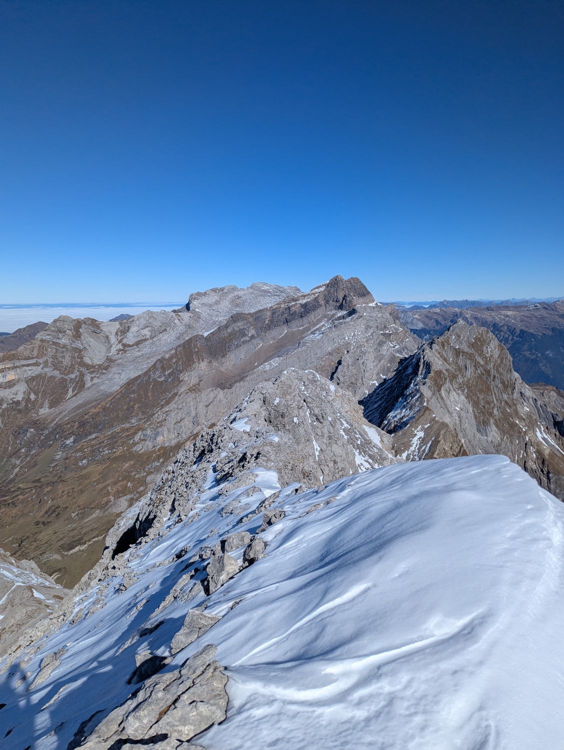 Schnee-Einsgemisch, Vorsicht ist geboten. Pickel bringt bizzli was, Steigeisen blieben eingepackt. Auflage teils sehr dünn und eisig, dann wieder gut stapfbar.