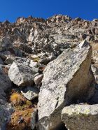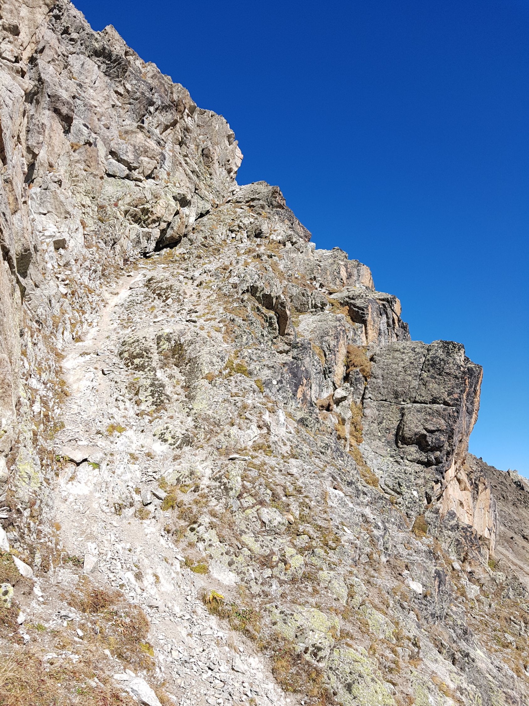 Dann nicht steil auf einen leicht erkennbaren Pfad mit vereinzelten Steinmänner über Schrofen hoch auf dem S-Grat des Piz Viroula bis zum Viroula Pitschen bei P2900 (T3). Kurz danach wird der S-Grat nicht nur etwas anspruchsvoller, sondern auch interessanter. Bis ca. 3007 Hm bleibt es aber im Blockgelände moderat (T4, I). In den wenigen paar Schneefelder keine Spuren gesichtet. Somit seit den letzten Schneefällen ist hier niemand hochgestiegen.