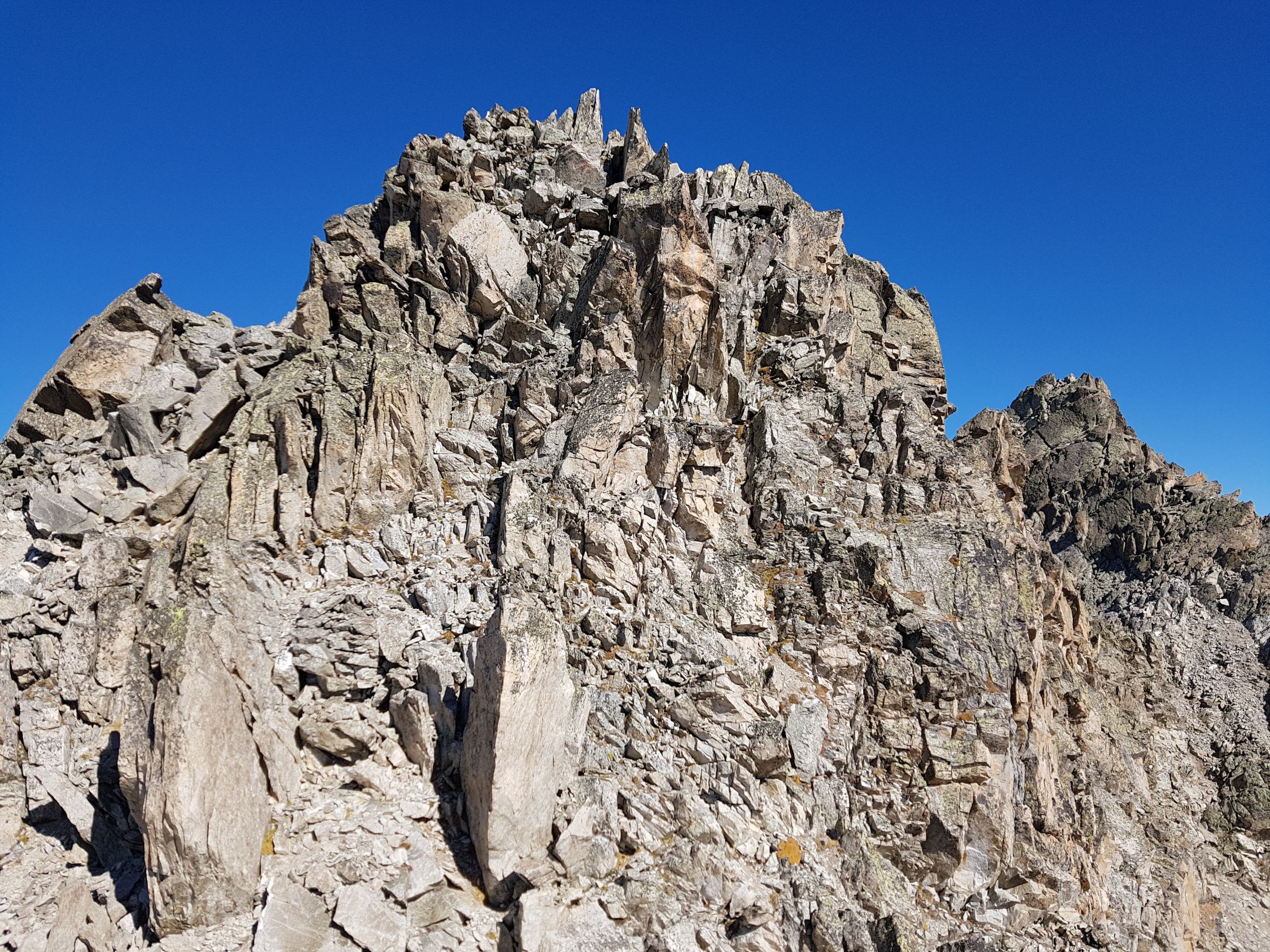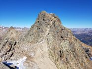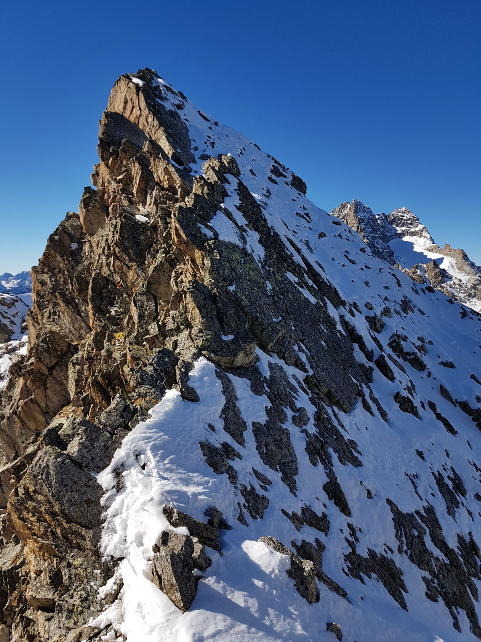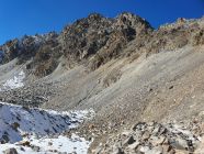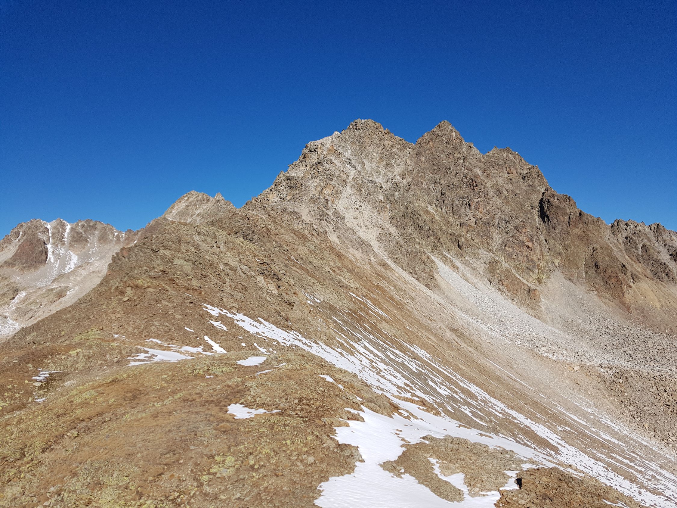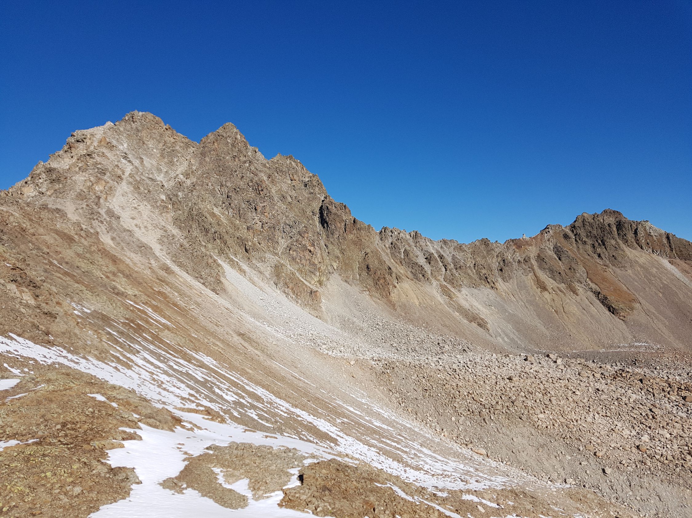 Ab dem Sattel bei ca. 3030 Hm wird es etwas steiler. Ab hier entweder auf dem Grat leicht kletternd oder in der W-Flanke auf einem sandigen Couloir hoch bis zum SW-Gipfel (T5-, I+). Nun kurz steil in die N-Flanke gänzlich ausweichen (T5, I) ODER anspruchsvoller ab der Mitte direkt auf den spitzigen Grat (T6, II) hinab zum Sattel vor dem Gipfelaufschwung. Heute wegen den doch noch vielen lockeren Schnee auf glatte schräge Platten in der N-Flanke weiche ich nach 10 Meter, wo das Gelände mit diesen Verhältnissen zu gefährlich wird, zum scharfen Grat hinüber. Hier südlich und ausgesetzt zum Sattel hinabgeklettert (T6, II+).