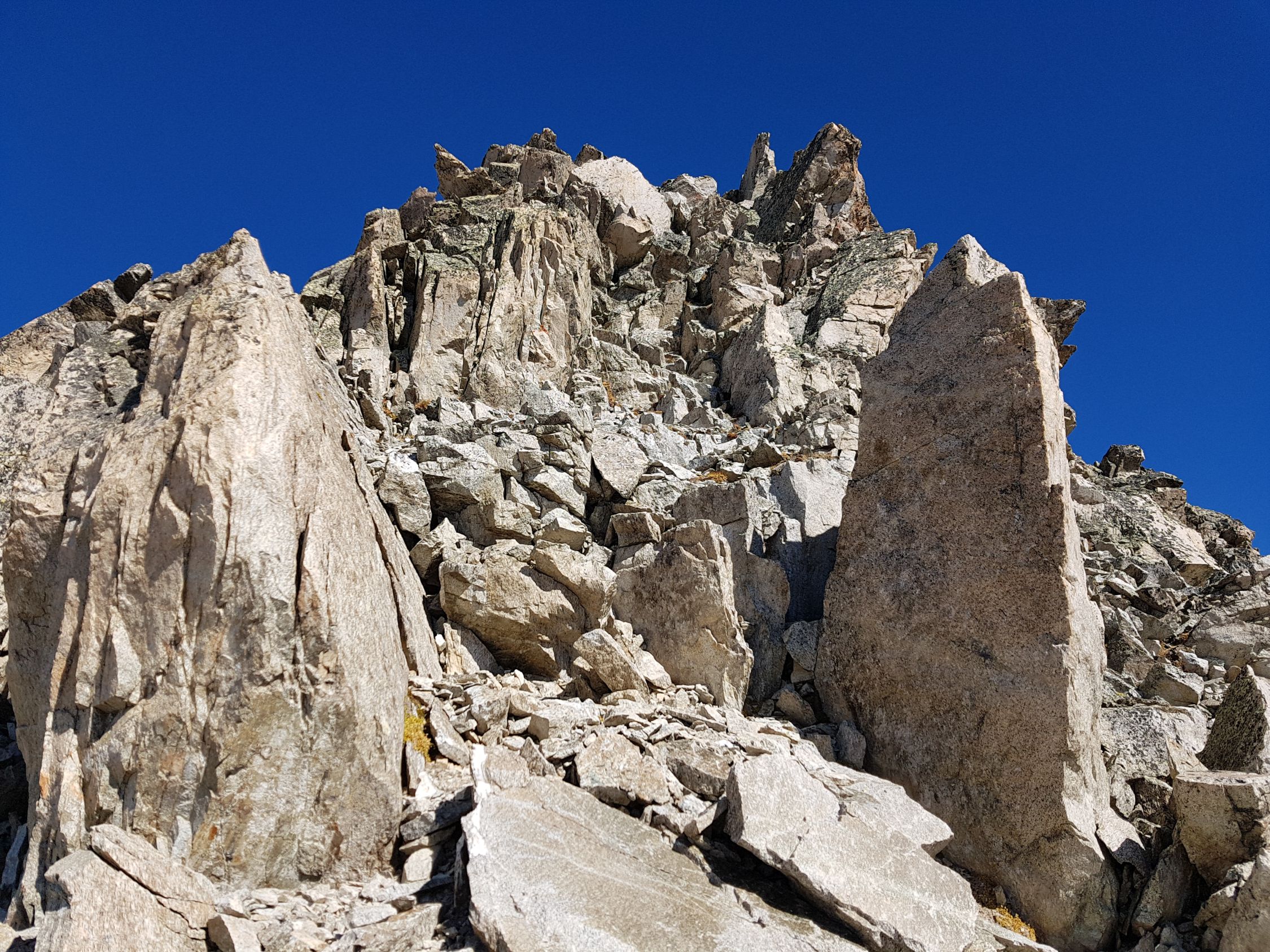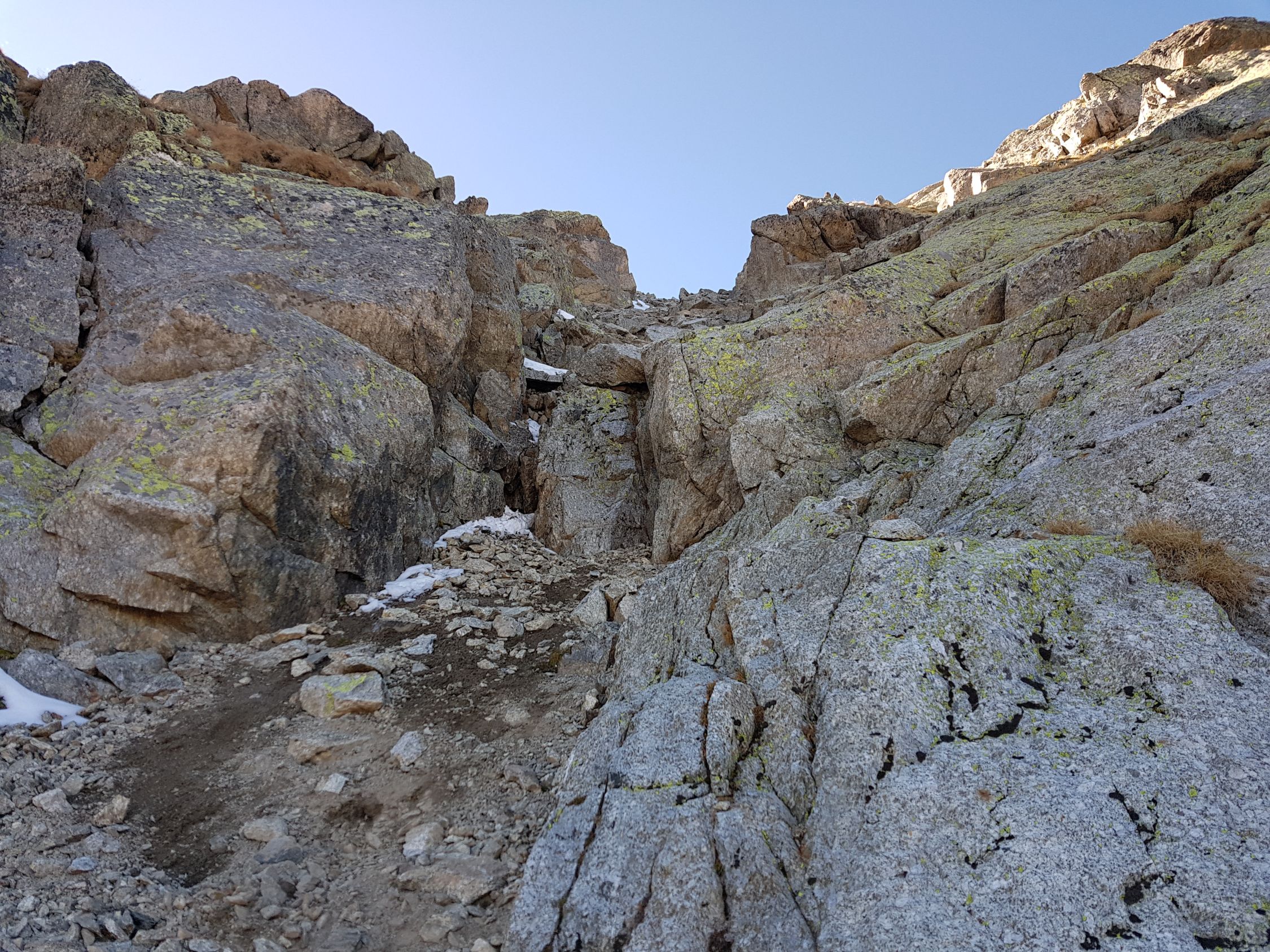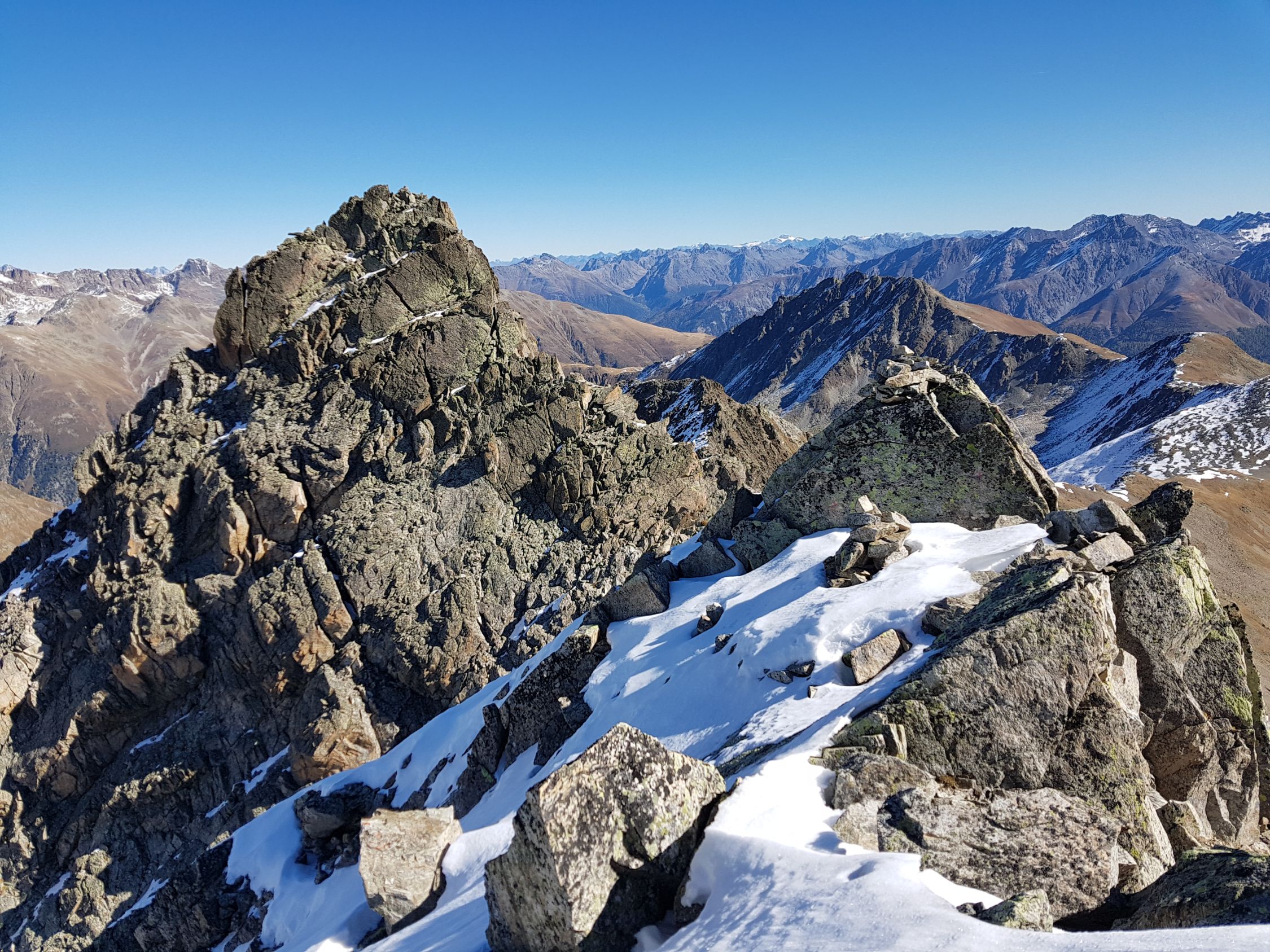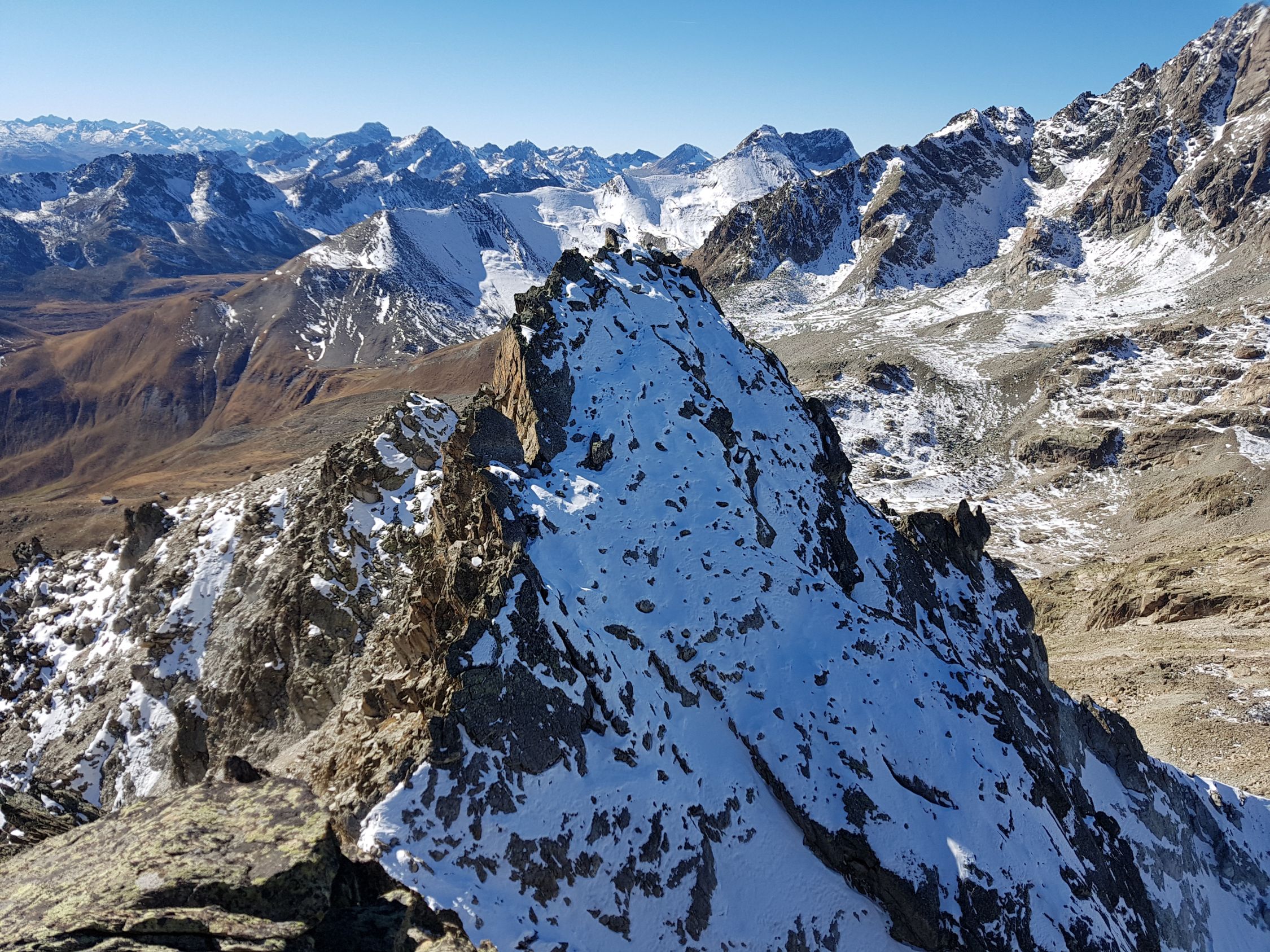 Ab dem Sattel bei ca. 3030 Hm wird es etwas steiler. Ab hier entweder auf dem Grat leicht kletternd oder in der W-Flanke auf einem sandigen Couloir hoch bis zum SW-Gipfel (T5-, I+). Nun kurz steil in die N-Flanke gänzlich ausweichen (T5, I) ODER anspruchsvoller ab der Mitte direkt auf den spitzigen Grat (T6, II) hinab zum Sattel vor dem Gipfelaufschwung. Heute wegen den doch noch vielen lockeren Schnee auf glatte schräge Platten in der N-Flanke weiche ich nach 10 Meter, wo das Gelände mit diesen Verhältnissen zu gefährlich wird, zum scharfen Grat hinüber. Hier südlich und ausgesetzt zum Sattel hinabgeklettert (T6, II+).