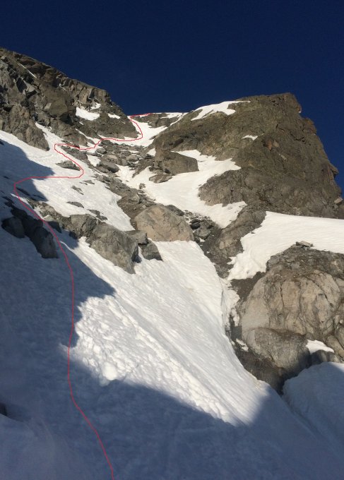 Die Abfahrt vom Gipfel war jedoch wider Erwarten ein grosser Genuss. Um 8.30 Uhr direkt und ziemlich steil ins Couloir eingefahren. Da der Schnee bereits sehr weich war, lösten sich beträchtliche Nassschneerutsche unter meinen Ski. Es ist darum momentan sehr wichtig, taktisch klug zu fahren um nicht mitgerissen zu werden. Tempo hilft. Eine ausgeaperte Felsstufe konnte ich überspringen, dies wäre bei harten Verhältnissen heikel, allenfalls die Ski abziehen und (einfach) abklettern.
