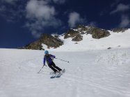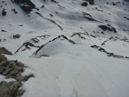 9:30 dann direkte Abfahrt vom Gipfel. Dieser Hang war schon zu aufgeweicht. Es lösten sich beachtliche Naßschneerutsche. Weitere Abfahrt dann bei gut zu fahrendem Sulz zum Ausgangspunkt und mit Ski am Rucksack wieder um 10:30 zum Auto.