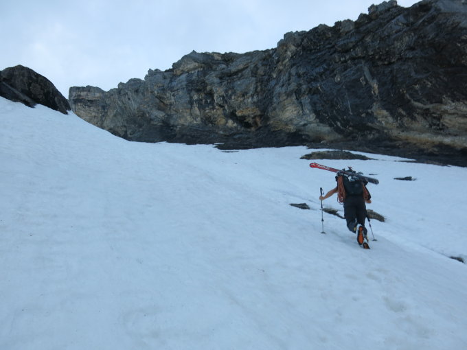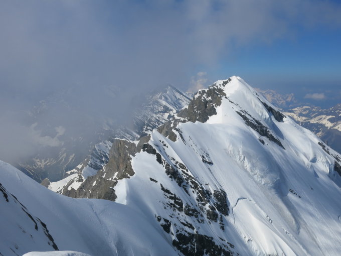 Abfahrt kurz unterhalb vom Gipfel durch Westcouloir die Felszone umfahrend, dann über den Rücken runter und den Bergschrund nahe Punkt 3201 überquerend. Ganze Abfahrt über den Gletscher am aufsulzen um ca. 11 Uhr.