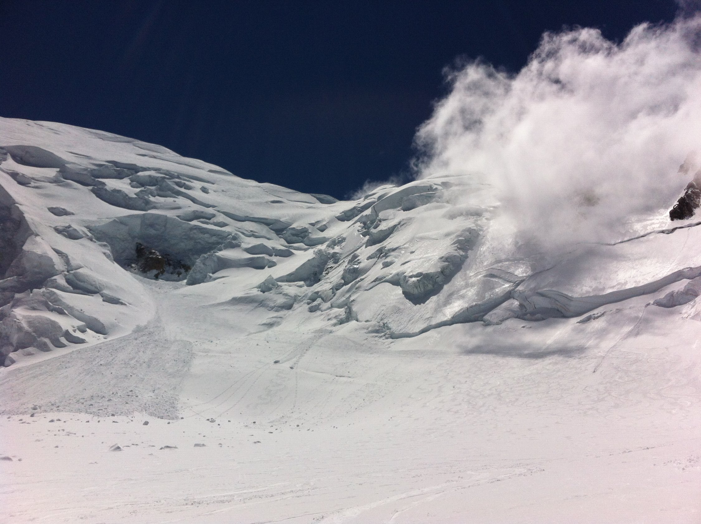 Abfahrt über Nordflanke (harte Verhältnisse, etwas locker-Schnee, kaum Deckel) zum Grand Plateau - Achtung, erst auf dem Grand Plateau wieder länger verschnaufen, Eisabbrüche(!) - via Petit Plateau zur Grand Mulets Hütte.