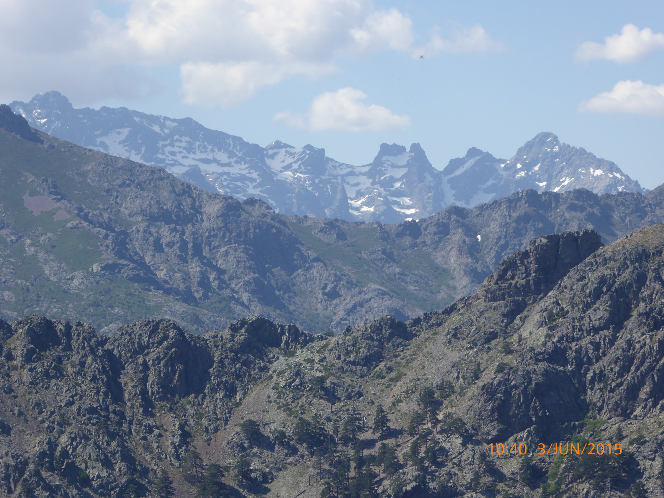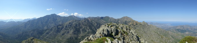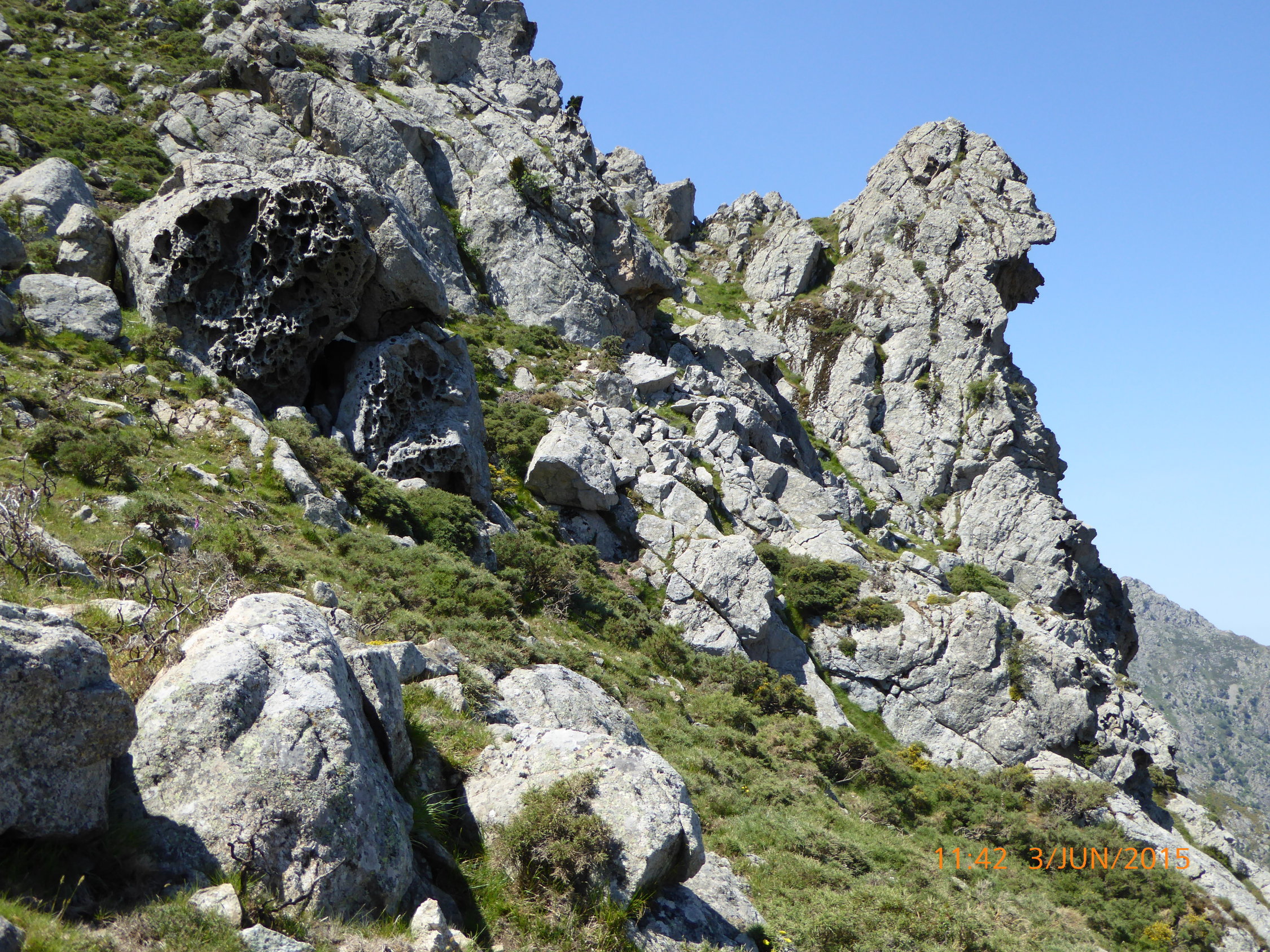 Die Tour wurde bereits am Mittwoch, 3. Juni 2015 durchgeführt. Für die gesamte Tour muss man etwa 5 Stunden reine Gehzeit einplanen. Besonders der Aufstieg zum San Parteo (1680 m) wie auch der Abstieg ist durch das Fehlen eines eindeutigen Weges sehr mühsam. Im unteren Teil des Gipfelaufbaus hat es Steinmänner. Es bedarf trotzdem einer guten Orientierung und ein Gespür für das Gelände, um eine halbwegs gute Aufstiegsroute zu erzielen. Trotzdem geht der Weg immer wieder verloren. Gerät man in Felspassagen ist Klettererfahrung (I-II) über kurze Passagen von Vorteil. Es hat während der 5 Stunden Wanderzeit keinerlei Unterstandsmöglichkeit. Deshalb nur bei sicheren Bedingungen. Bei aufziehendem Dunst/Wolken oder Nebel wird die Orientierung am San Parteo durch den fehlenden durchgehenden Weg faktisch unmöglich. Aus beiden Gründen früh starten (etwa 8 Uhr am Pass). Vom Gipfel des San Parteo eine fantastische Sicht auf die Nordflanke des Monte-Cinto-Massivs. Im Abstieg sucht man sich durch die Mitte des Gipfelaufbaus einen halbwegs gangbaren Weg und hält sich dann im unteren Teil der Route querfeldein nach links, um auf den orange markierten Wanderweg zurück zu gelangen. Am Monte Tolu (1332 m) bin ich am Morgen glatt vorbei gewandert. Es ist eher ein Fels (schöne Kletterrinne, I, gute Aussicht auf die Balagne) als ein Berg. Durch das stark durch Dornengestrüpp verwachsene Gelände sind lange Hosen auf der gesamten Tour von Vorteil