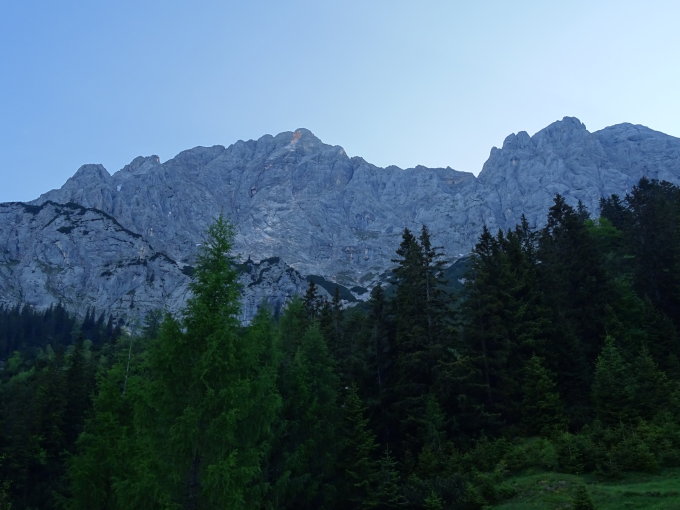 Abstieg Richtung Traunsteiner Hütte und zur Mayerbergscharte hat noch viele aber unkritische Schneefelder;