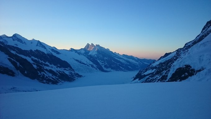 Wir sind von der Mönchsjochhütte um 5.00 Uhr gestartet. Der Schnee war sehr gut durchgefroren. Grosse Spalten sind gut sichtbar, die kleinen noch gut zugeschneit.