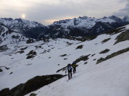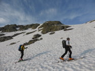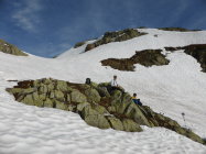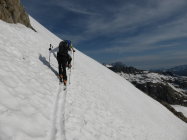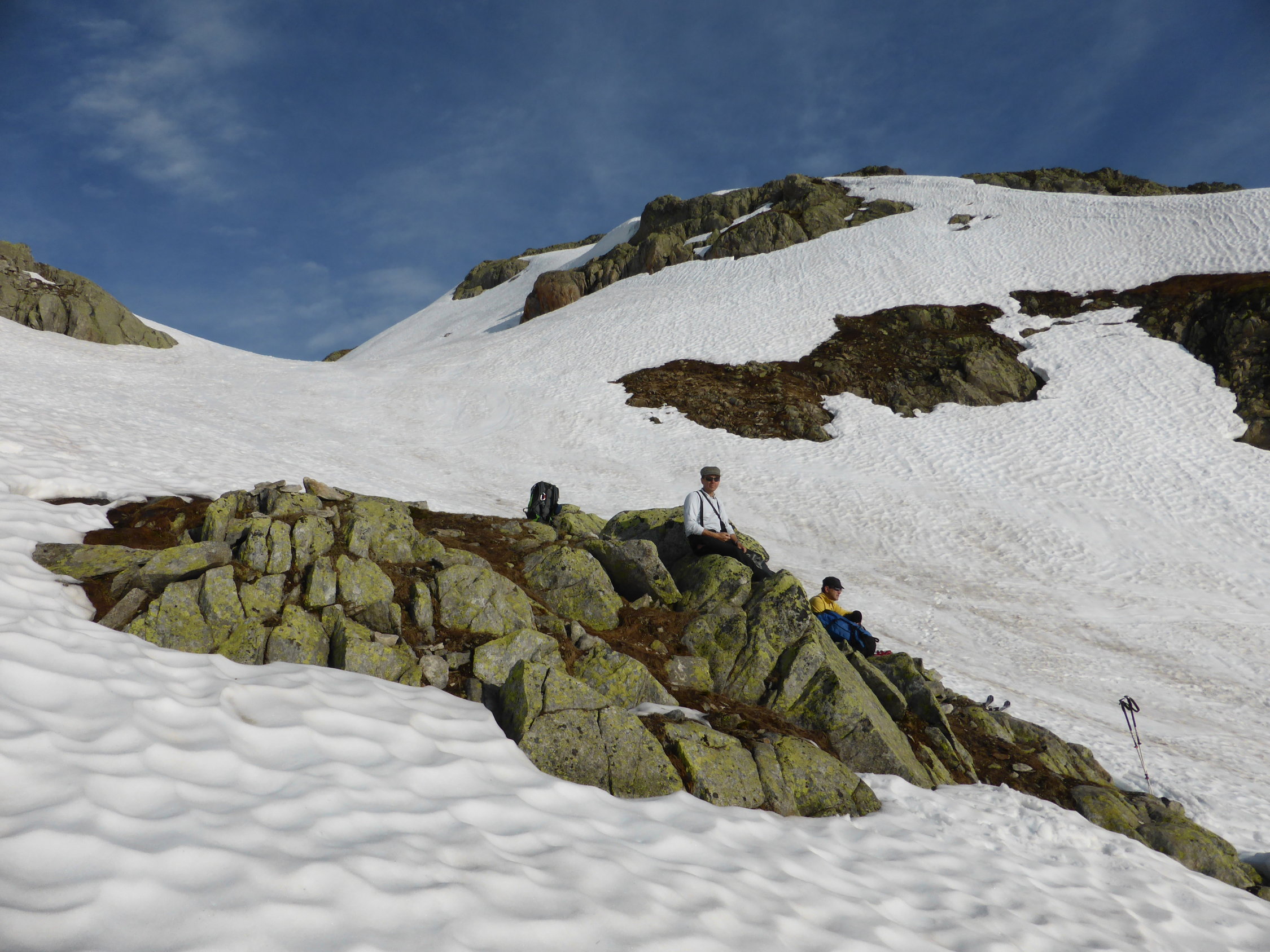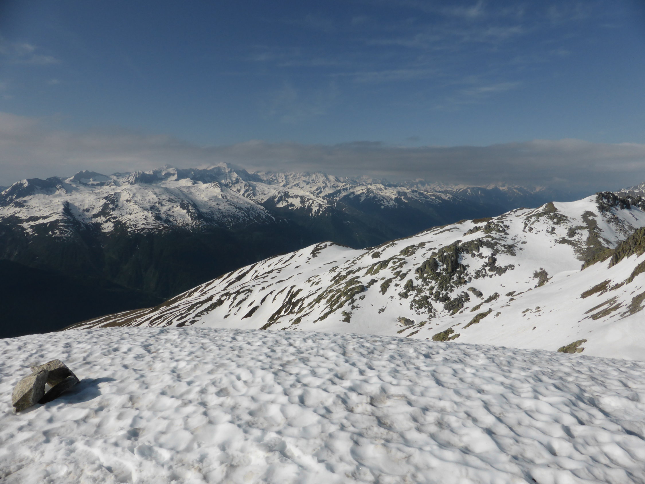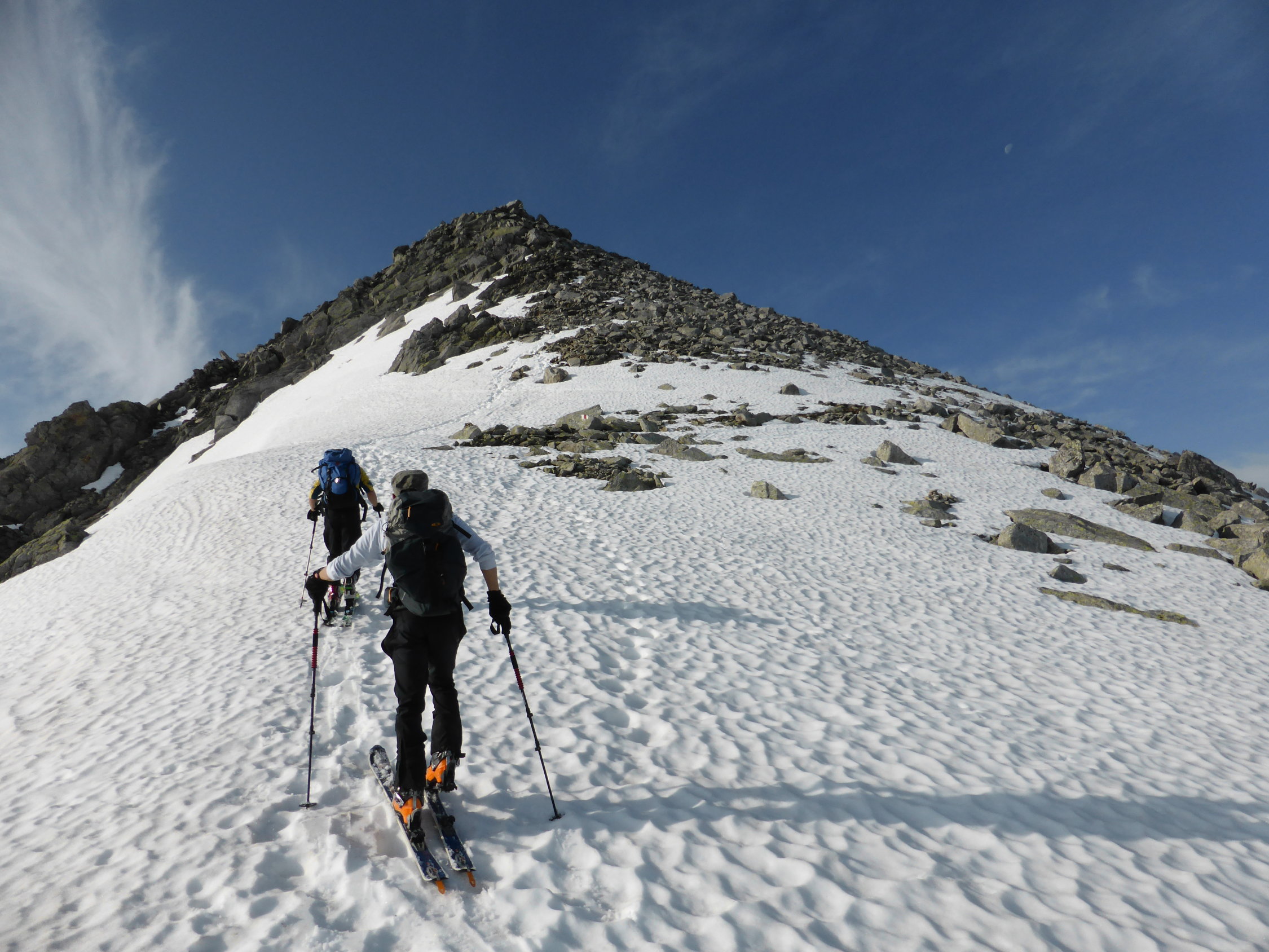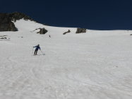 Am Pass um 05.45 Uhr 11 Grad und praktisch windstill, Schnee nicht gefroren jedoch auch kein einsinken, Schnee hat sich gut gesetzt - sehr angenehm zum gehen, in den steileren Abschnitten dann teilweise etwas rutschig, alles in allem aber sehr gute Frühsommerverhältnisse(im Schlussteil begingen wir die Variante zum Nordgrat), auch die Abfahrt war purer Genuss, weich und doch nicht tief, zudem machte auch das Wetter super mit, am Anfang noch leicht bewölkt(kurz etwas bedeckt) dann immer besser bis zu perfekt = so muss es sein!