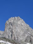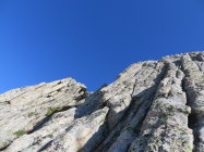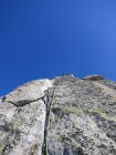 Die unteren Seillängen sind plattig und es hat immer wieder Bohrhaken. z.T lässt sich auch gut ein Friends legen. Im mittleren Teil werden die Haken seltener, aber mit Schlingen und Friends kann man die Route gut absichern. Am Schluss wird es wieder etwas steiler und auch wieder plattiger.
