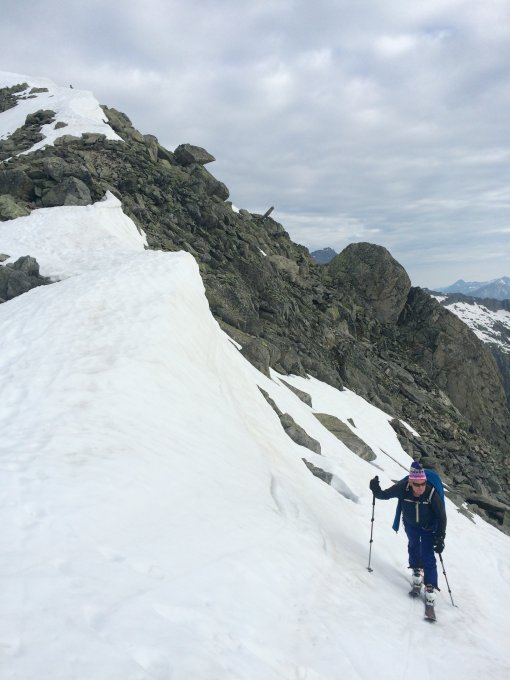 Im oberen Bereich dann eine hervorragende Spur die zwar steil, aber sehr gut zu gehen zum Gipfelgrat führt. Wo wir vorgestern noch bequem hochgefellt waren, kommt jetzt bereits das Geröll zum Vorschein. Eine Gipfelbesteigung mit den Ski ist zwar noch möglich, aber nicht mehr besonders lohnend.