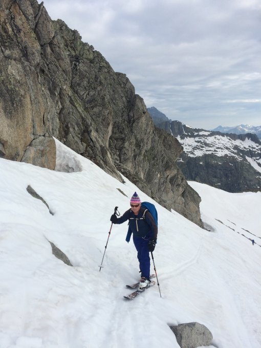 Eindrücklich zu sehen, wie viel Schnee in den 2 Tagen wegschmolz. Im kleinen Tälchen gleich zu Beginn hat es nun eine kurze Tragepassage. Darum besser in einem grosszügigen Linksbogen um den kleinen Hügel herum und oberhalb die Steilstufe wieder wie gehabt in einem grossen Schwung hochziehen.