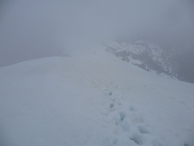 Nur einzelne Spuren waren im Sulzschnee vorhanden. Stellenweise fast knietief im Schnee eingesunken. Keine Gletscherspalten waren sichtbar und kein Blankeis auf der Route.