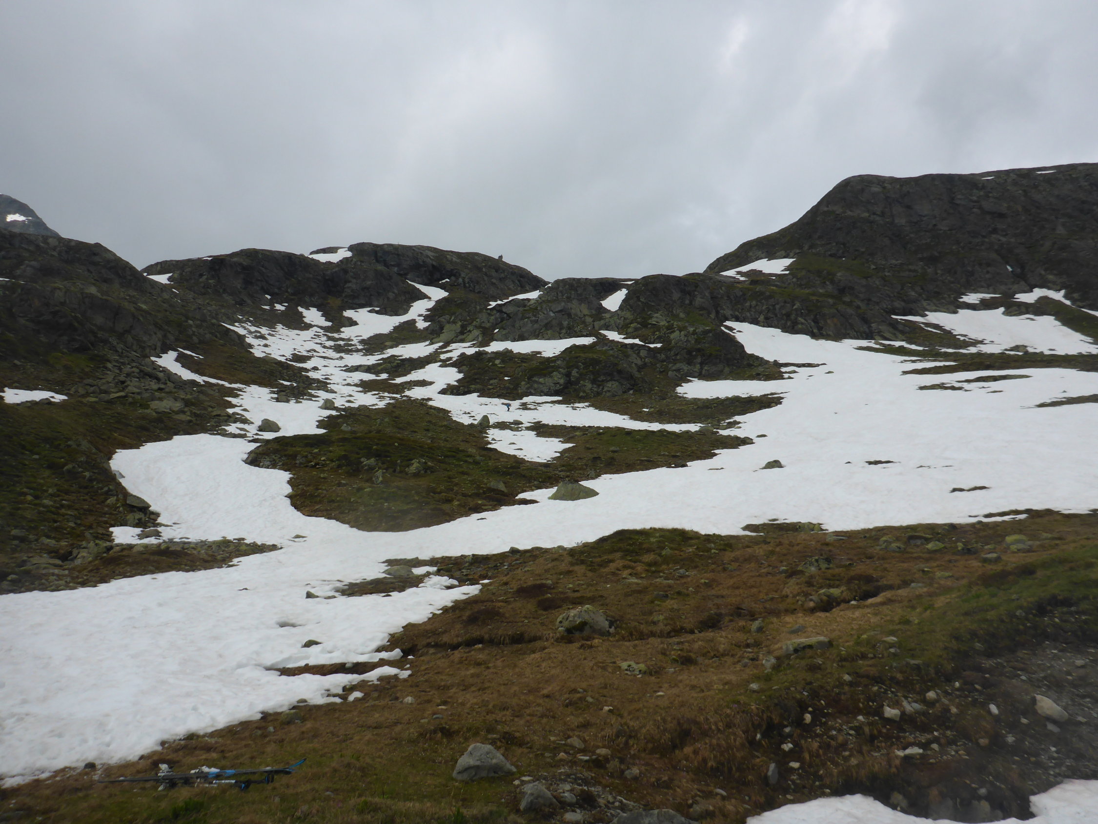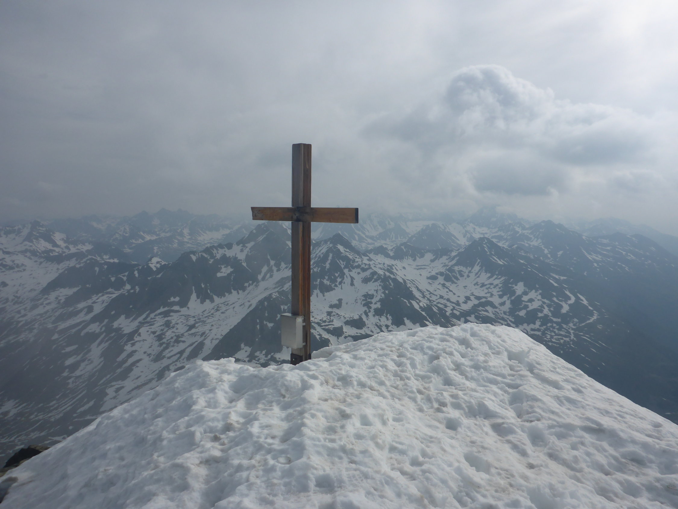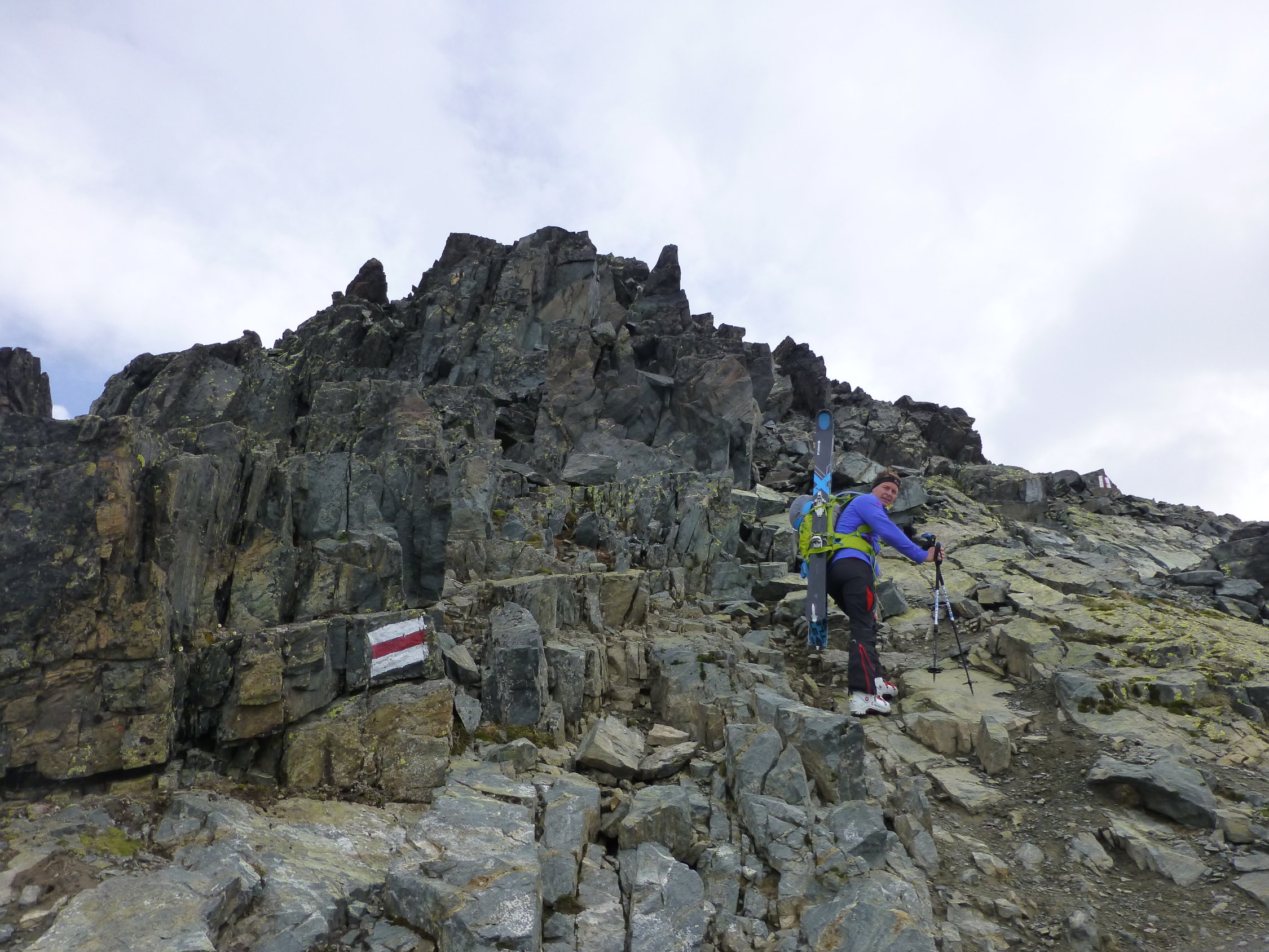 Kürzere Tragestellen (unter 20 Meter)gibt es bis zum Gipfelaufbau vielleicht 2-3; Dann am Schwarzhorngipfelplateau ca. 15 min Tragestelle bis wieder eine Schneeauflage da ist.