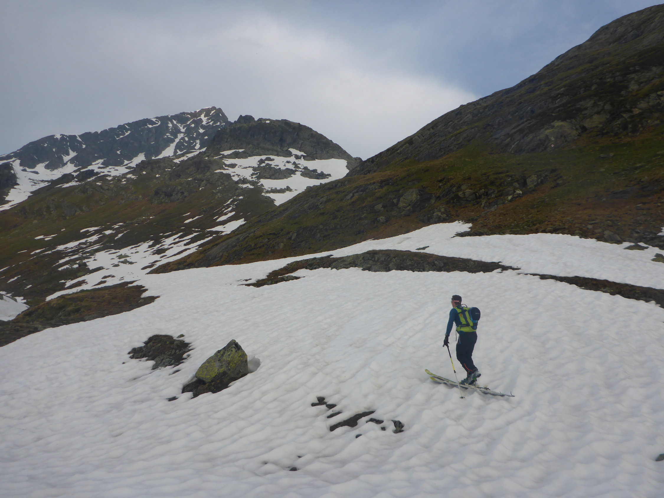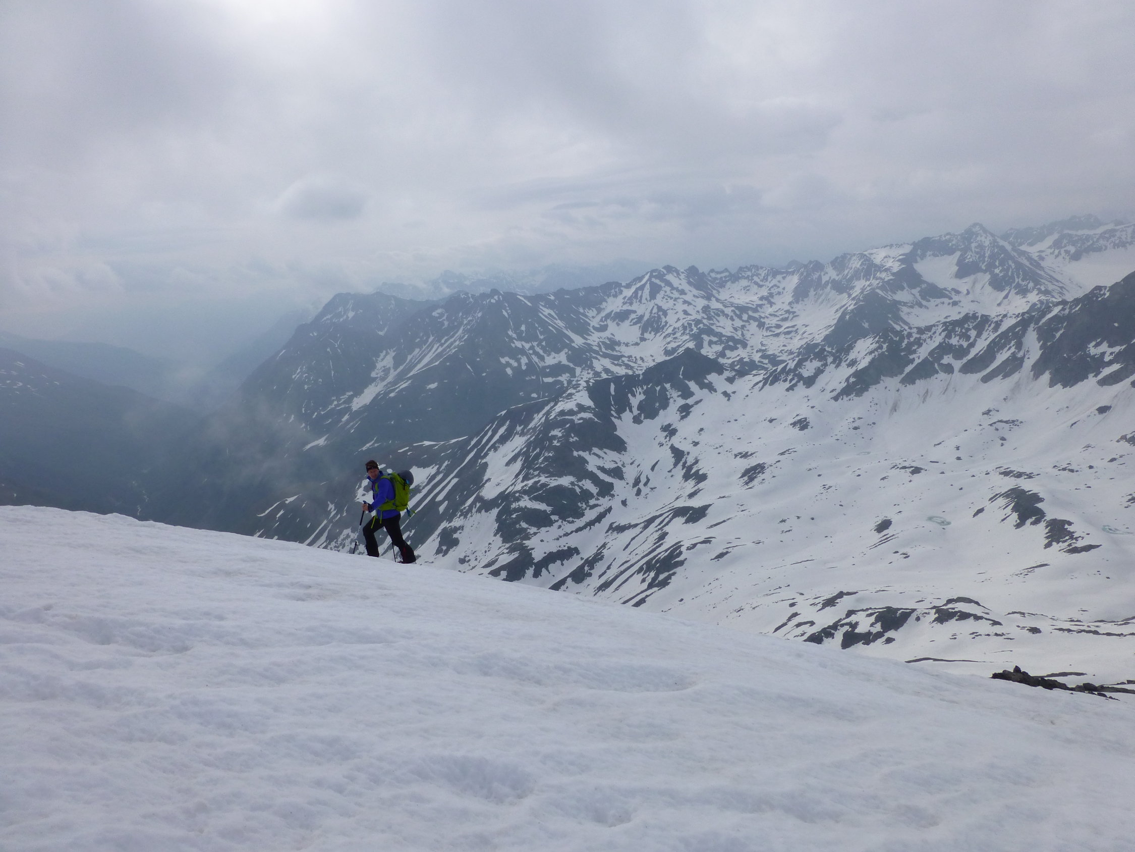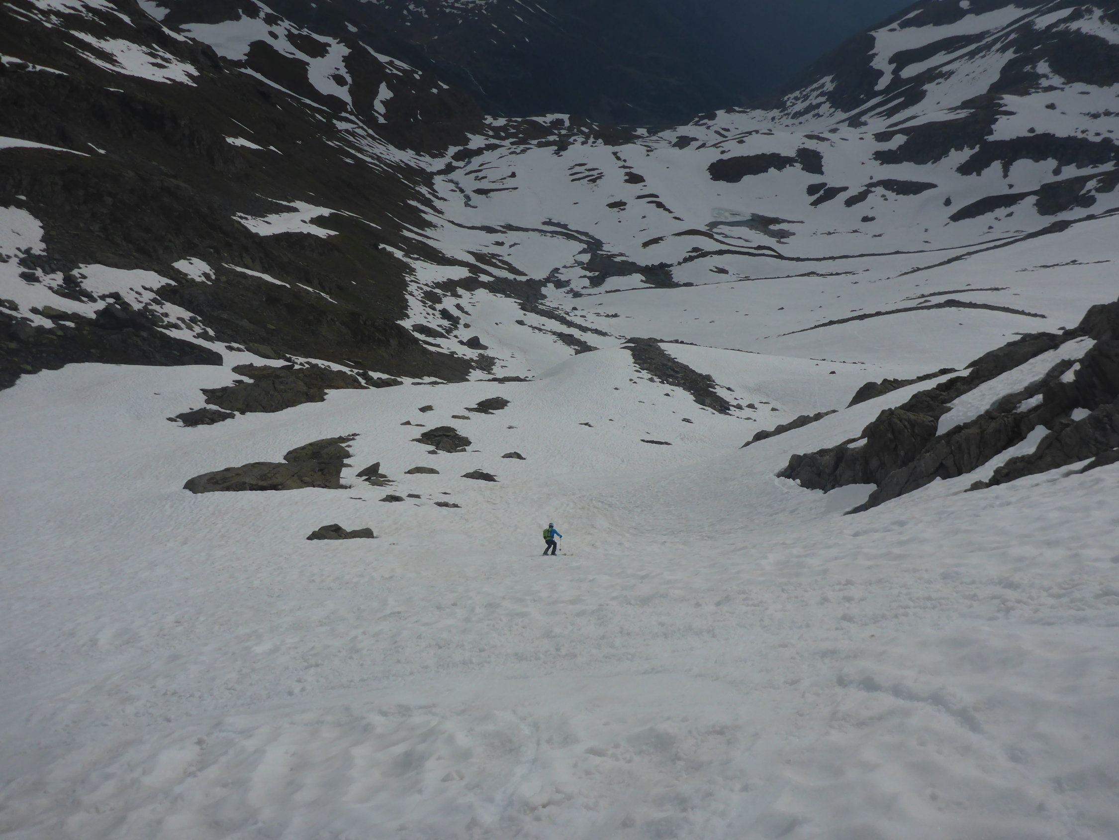 Abfahrt bei halbwegs gut zu fahrendem Sommerschnee.