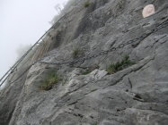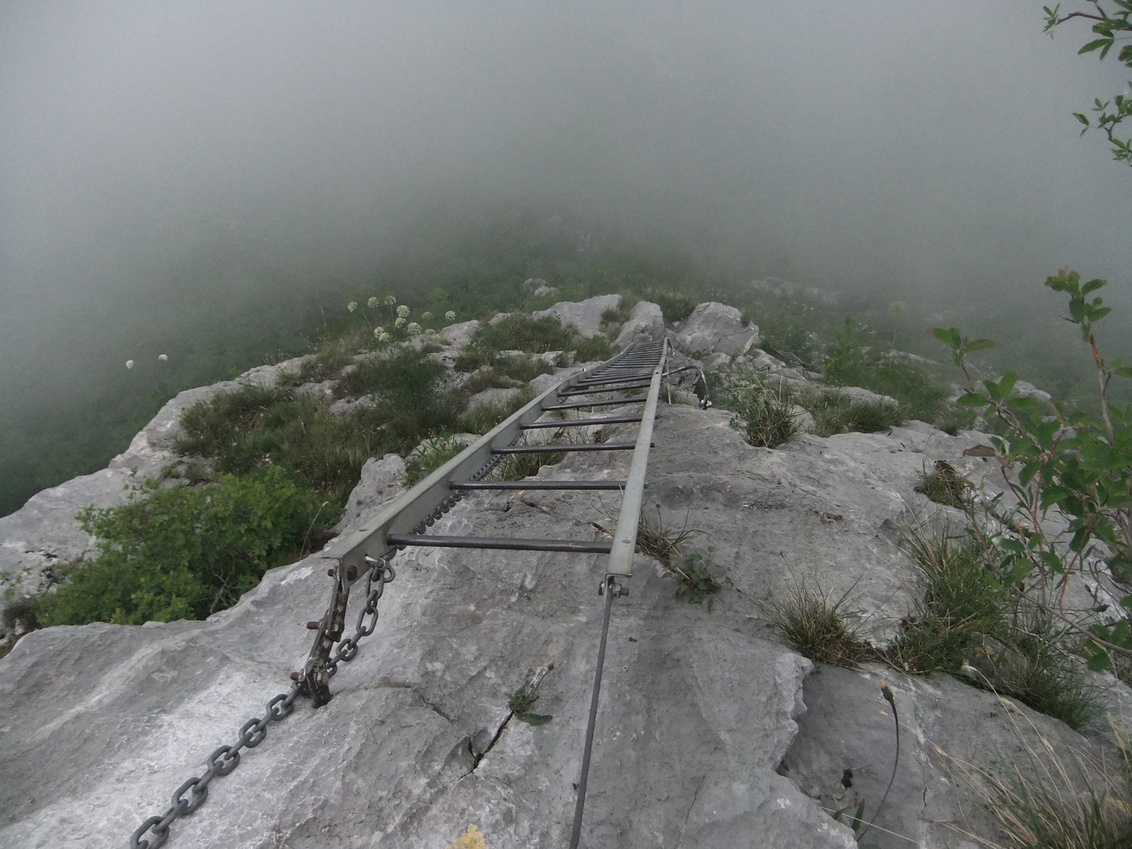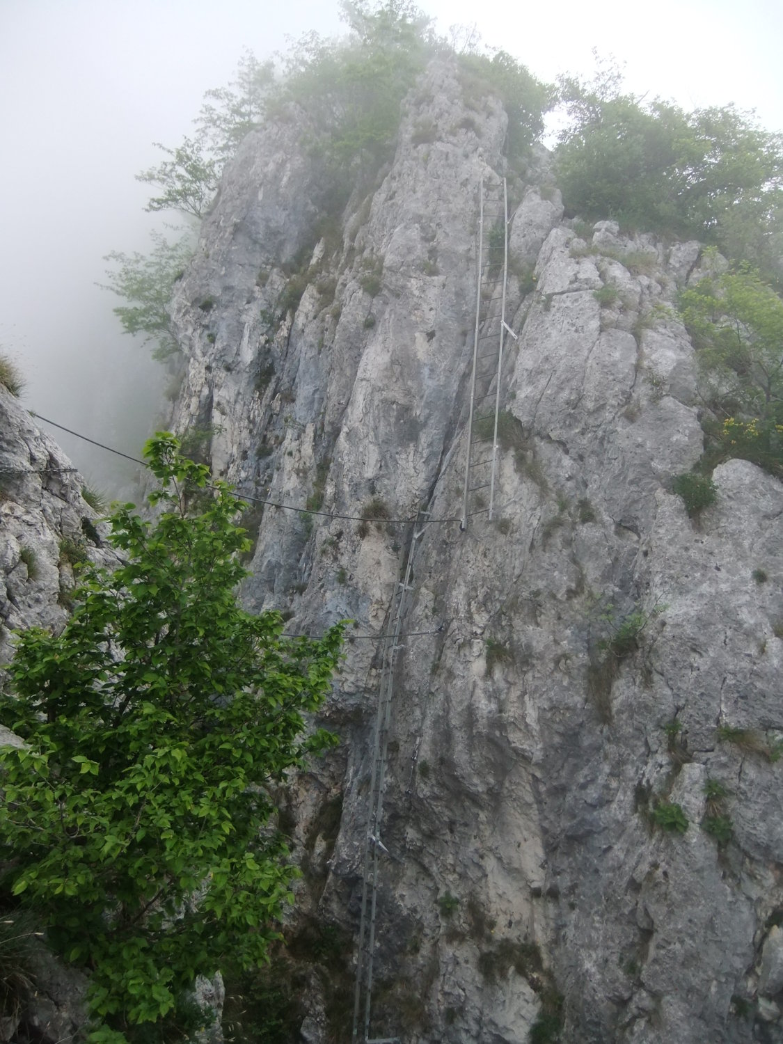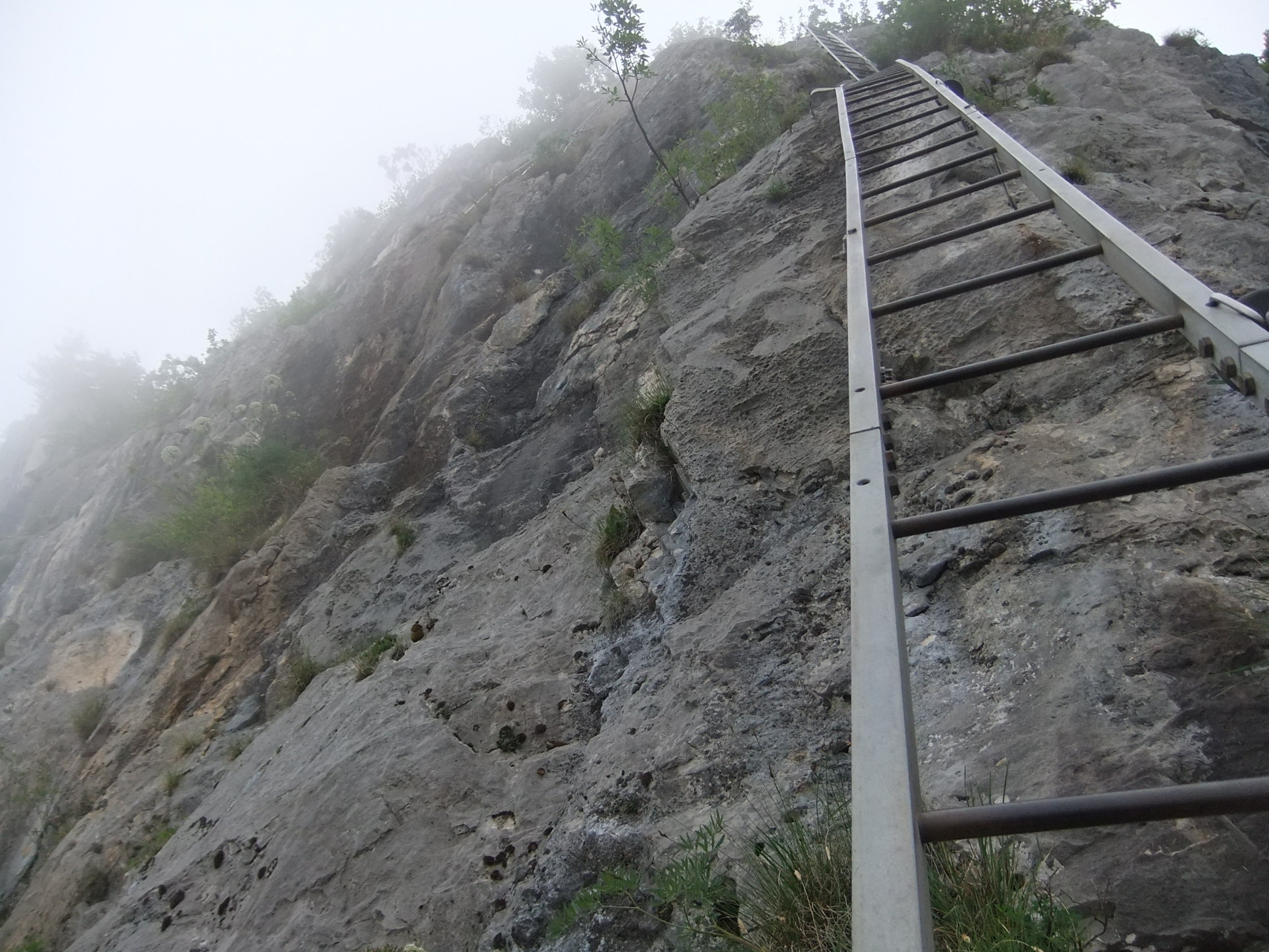 Tourenbeginn um 06:30 Uhr. Ein Steig mit so vielen Leitern (wohl in Summe mit über 200 m Länge auf 600 Hm verteilt) ist mir bisher noch nicht begegnet. Das Wetter zog zu. Die Nebelwolken bewirkten feinen Niesel. Sicht am Vormittag gleich Null. Darum verzichtete ich auf Fortsetzung der Tour mit dem KS Gamma II. Sondern stieg zur Via ferrata de Franco Silvano weiter (extra Tourenbeschreibung).