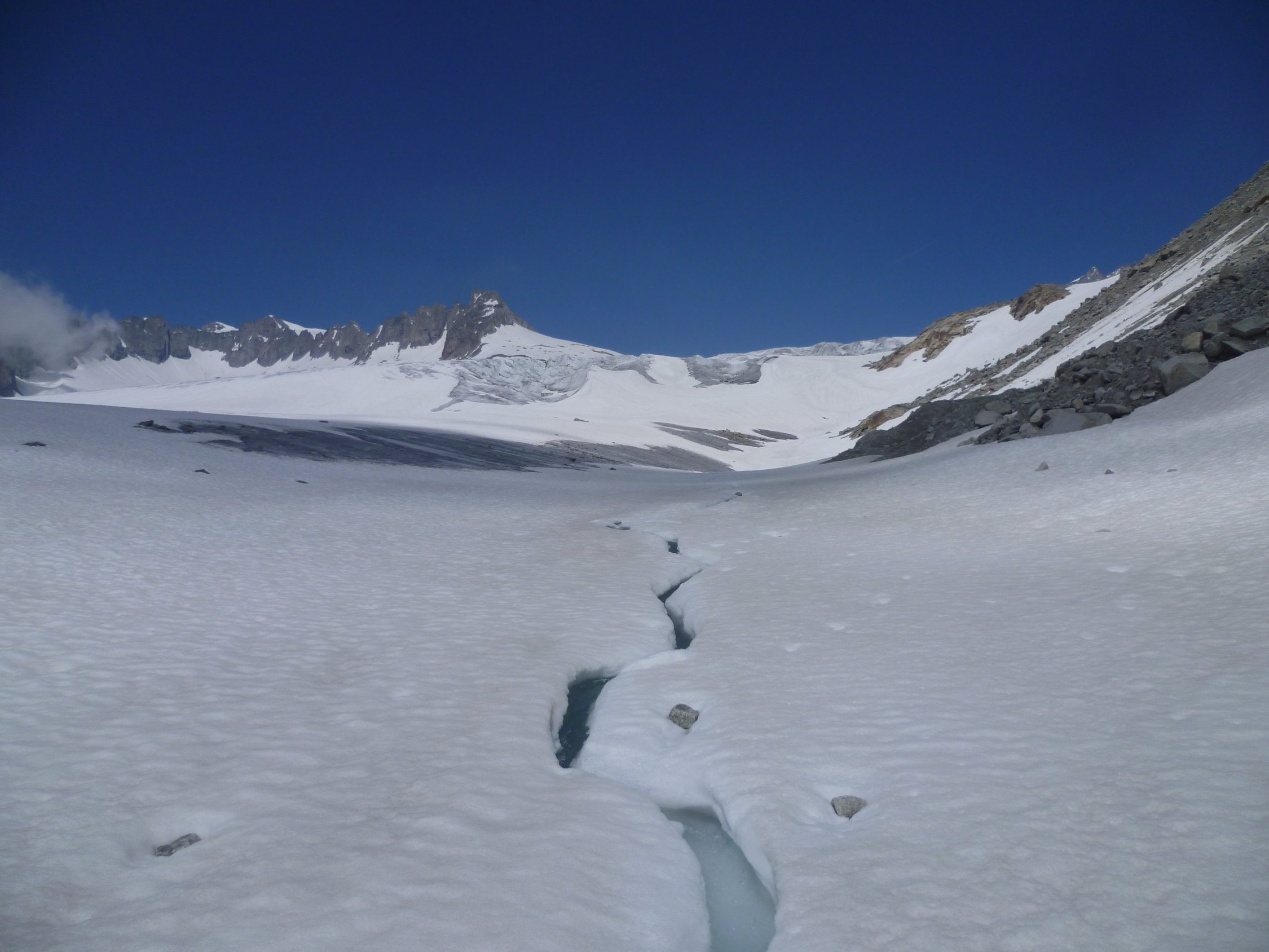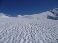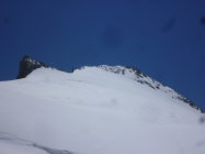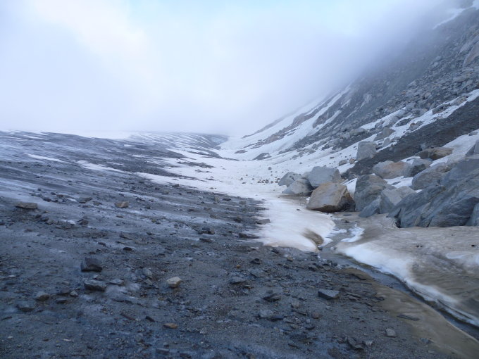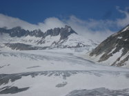 Um 6:15 Uhr bei der Eisgrotte (bei plus 2 Grad)gestartet und heute nur noch 2 andere Tourengänger gesehen, die aber auch nicht zum Dammastock stiegen. Im unteren Teil des Rhonegletschers bereits einige Steine und Blankeis (ungut für die Skis!)sowie Gletscherbäche (gut zum trinken!). Weit nach P. 2769 wurden die Reste der Skispur erst langsam sichtbar. Am morgen auch unten noch harter Deckel, also gut zum steigen. Am Eggfirn Schnee auch noch um Mittag hart und tragend, sonst sulzig.