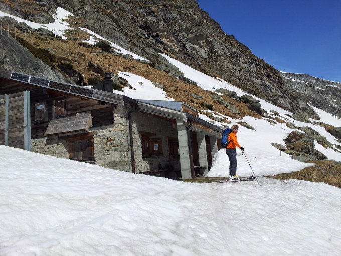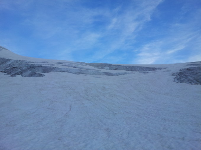 5 Minuten Ski tragen, bei der Steilstufe hats nicht mehr viel Schnee, 2-3 warme Tage und es braucht Steigeisen. Die obersten 700 Hm topfeben aber mangels Sonneneinstrahlung steinhart, unten der Firnschnee leicht holprig, auch da zu hart, paar Grad wärmer, dann ists Creme.