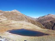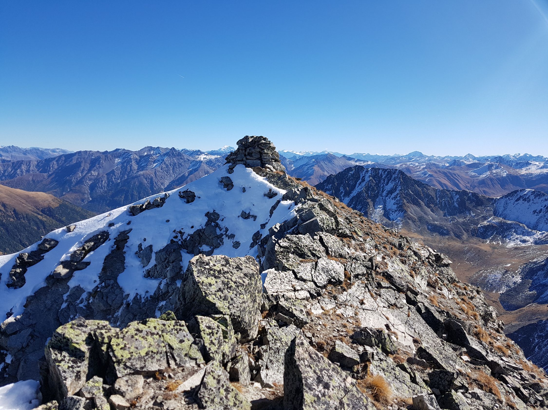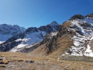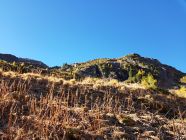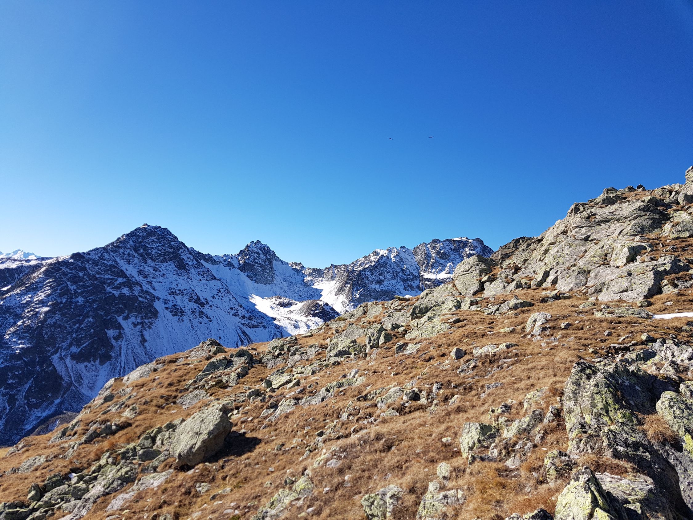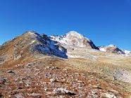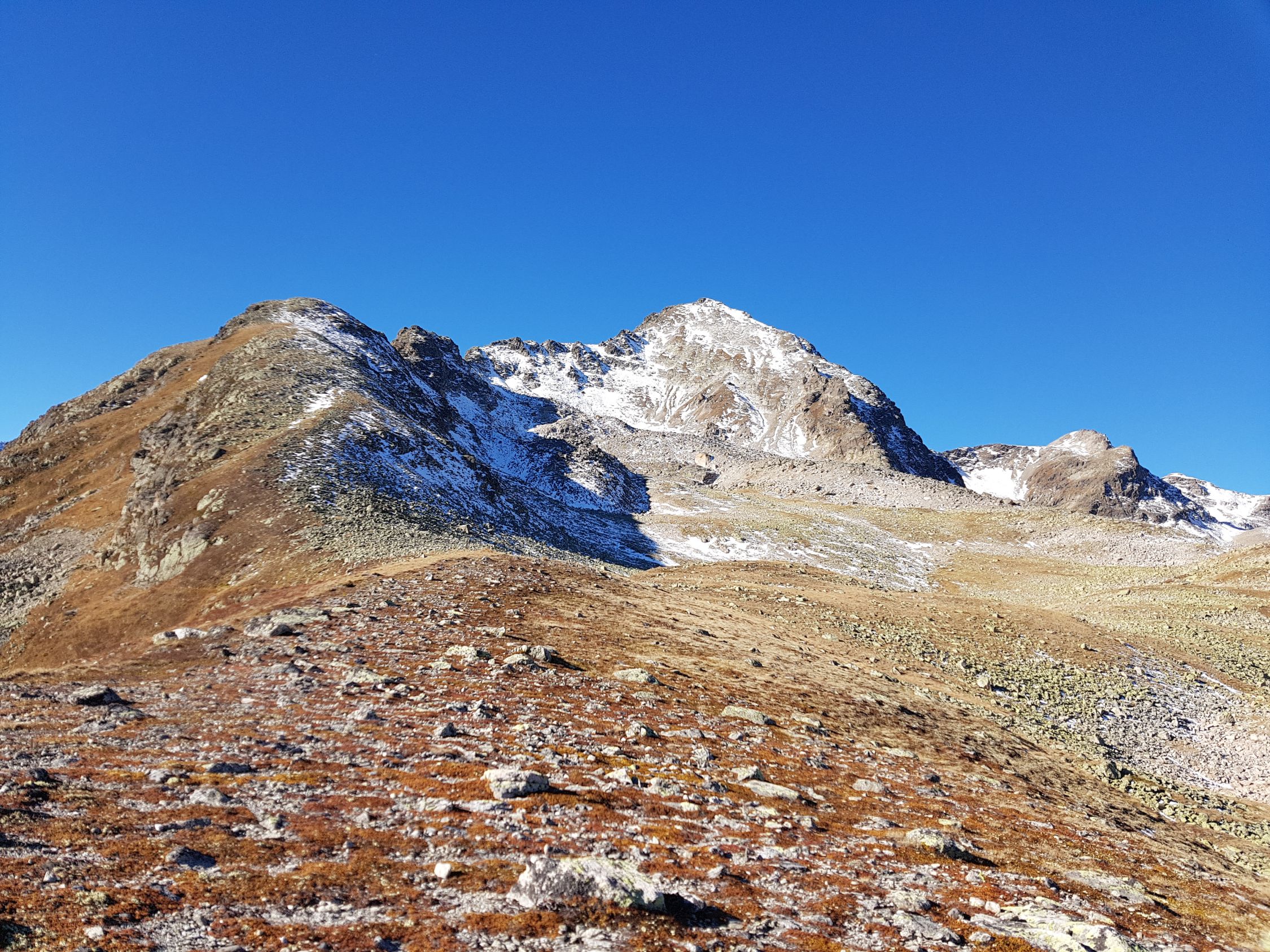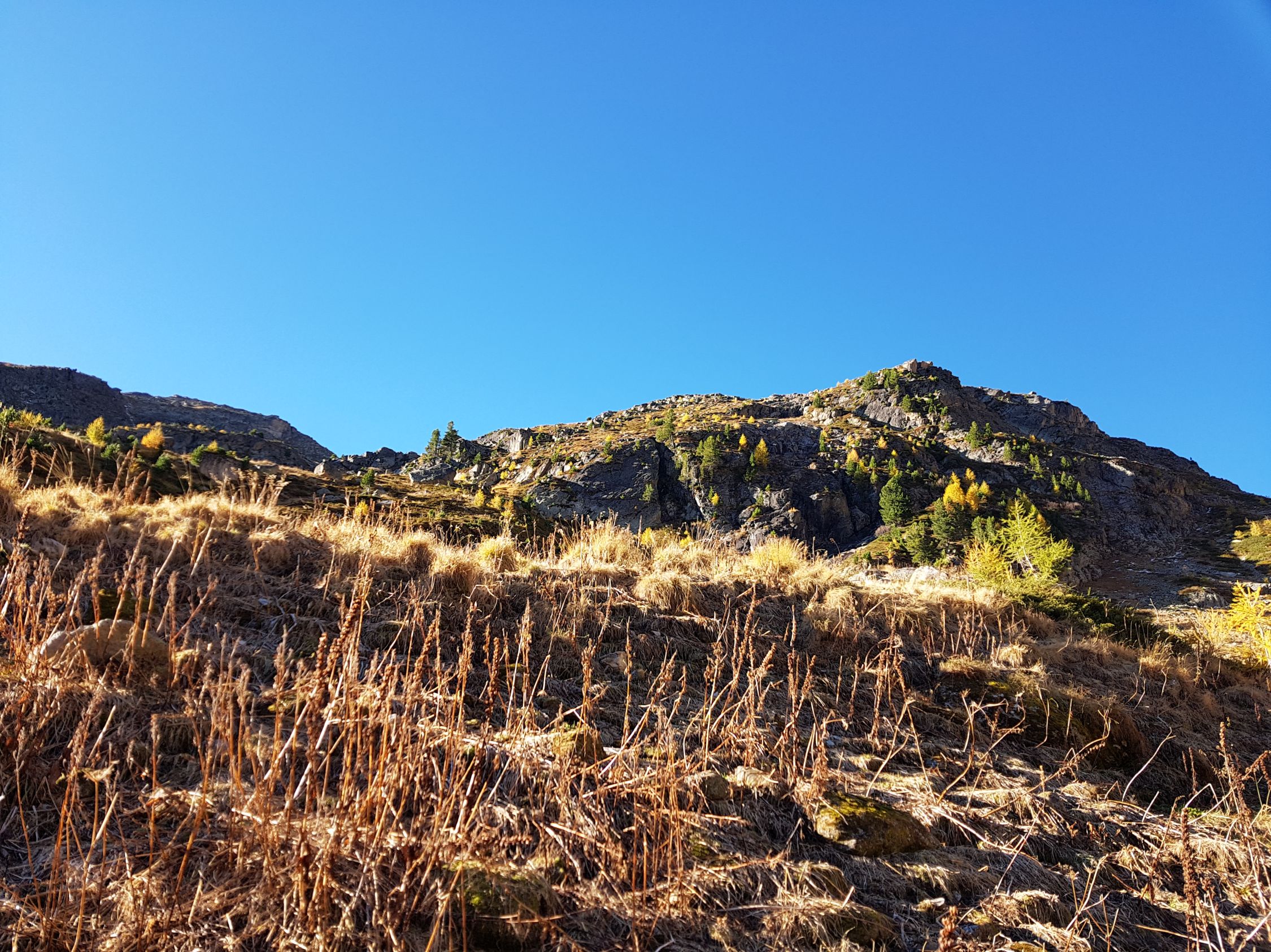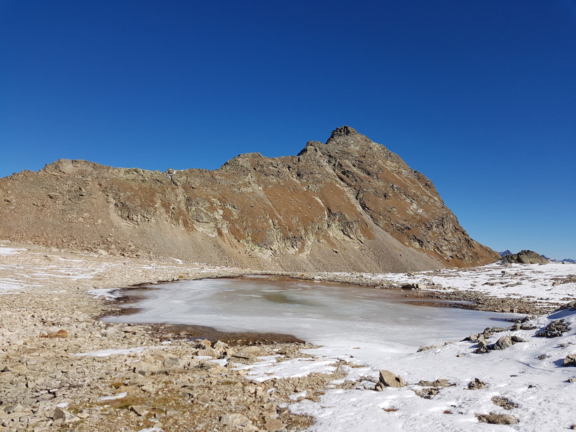 Ab der Alp Pignaint zweigt ein nicht markierter Wanderweg in die Val Müsella bis ca. 2'200 Hm in einem Sumpfgebiet. Danach weglos in südlicher Richtung über Wiese zuerst in eine Art Mulde, später auf dem NE-Grat vom Piz Viluoch. Beim kleinen Seelein bei P2570, der bereits leicht eingefroren ist, mache ich kurz eine Rast und wechsle meine Schuhe. Der E-Grat sieht von hier nicht besonders anspruchsvoll aus, so spaziere ich ohne viel nachzudenken auf dem E-Grat leicht über Geröll und Wiese bis ca. P2792 (T3), wo der Grat abrupt messerscharf wird.