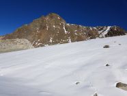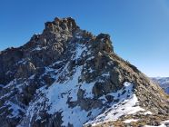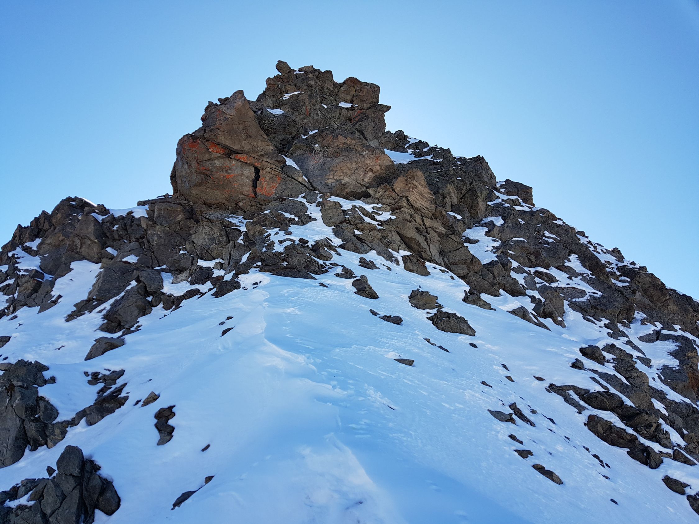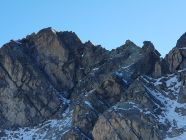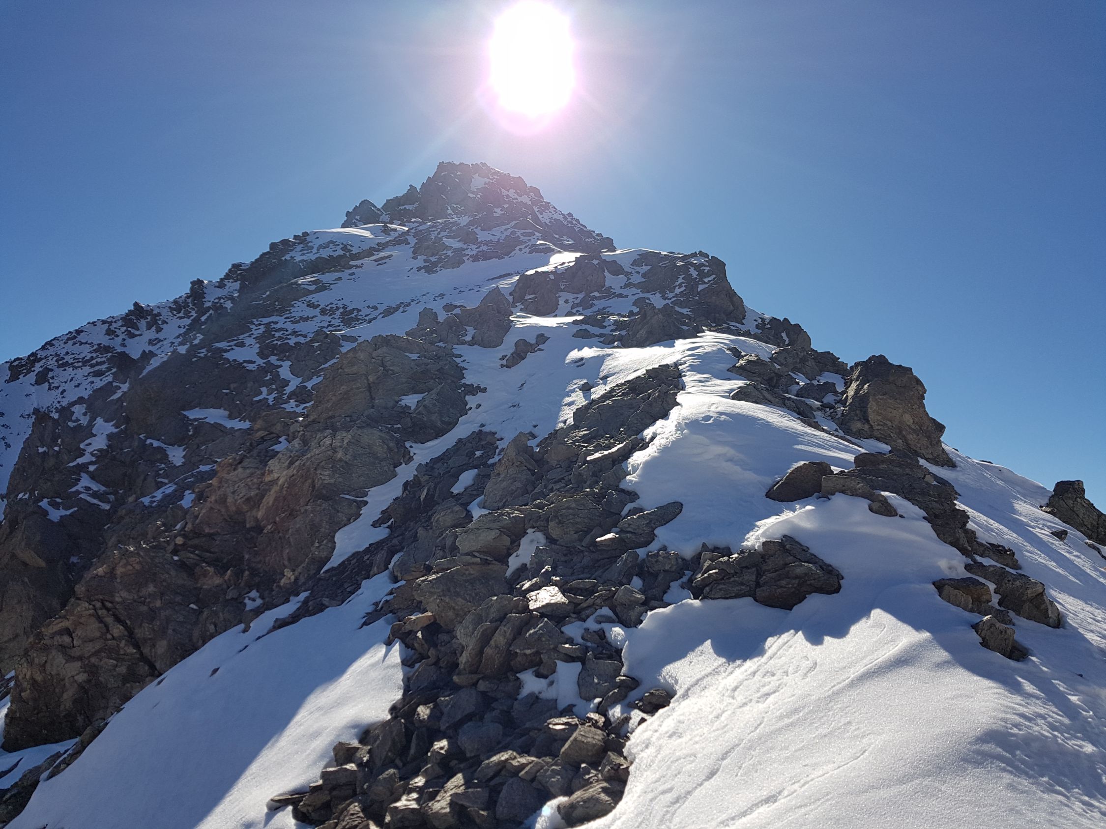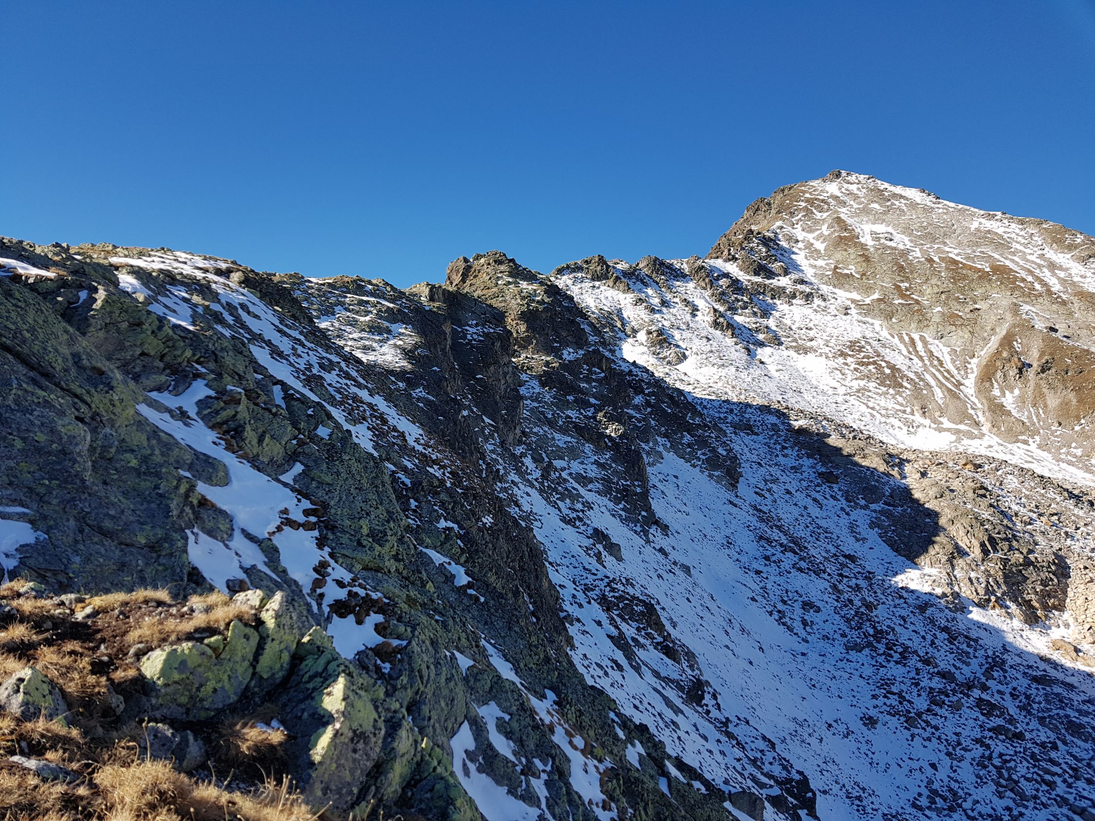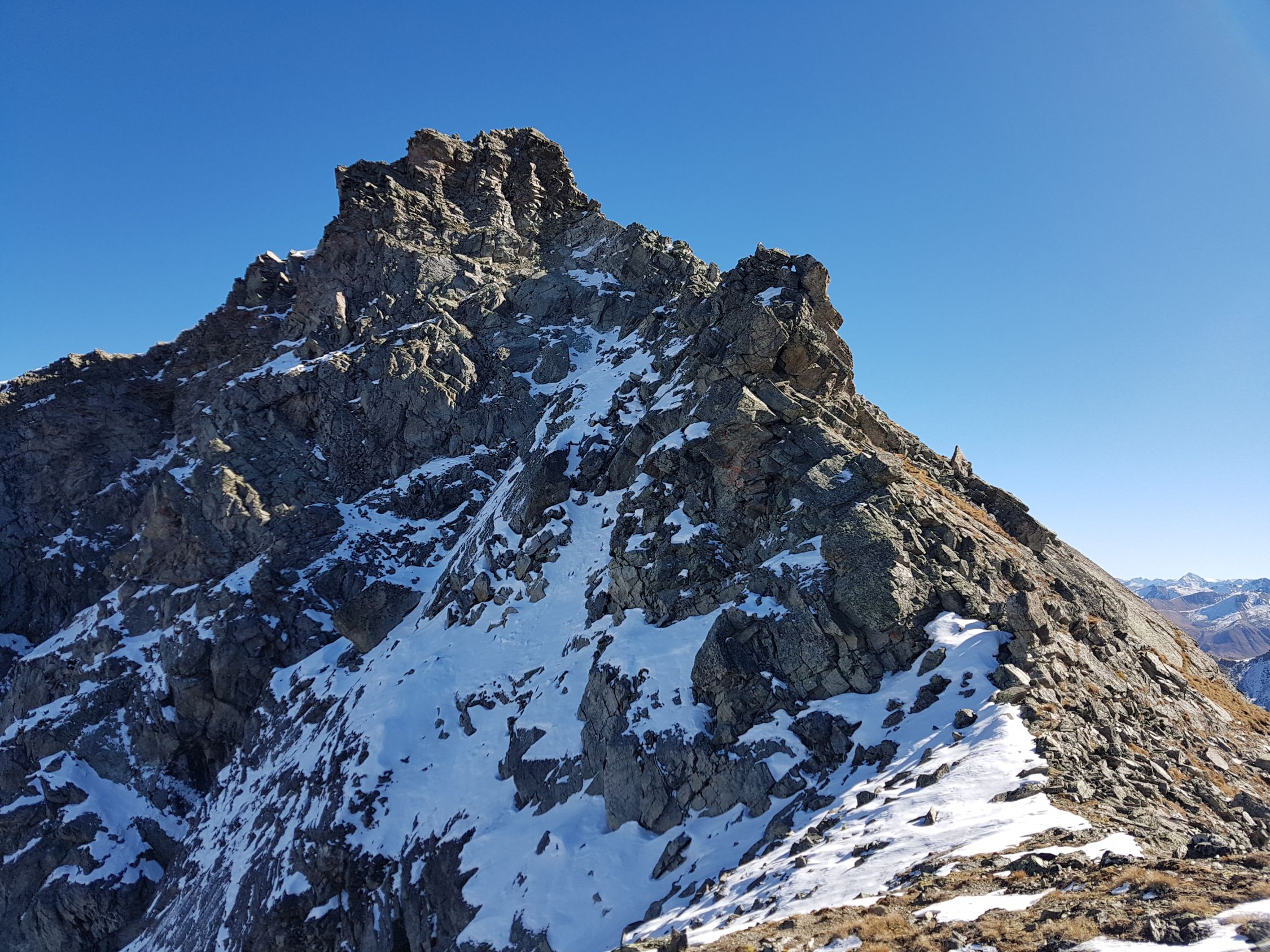 Auf dem N-Grat kommt doch noch harte Arbeit auf mich zu. Ich muss nicht nur knietief, sondern auch ausgesetzte spuren. Ich klettere anschliessend die ersten Felsen direkt hoch (T6, II+), überwinde eine kleine grusige schneegefüllte Rinne, die seitlich auf den Felsen mit Eis geschmückt ist (T6+, III) weiter auf der Gratlinie bis zu einem noch grossen senkrechten Turm. Diesen zu Überklettern wäre anspruchsvoll gewesen, hoch wäre ich da gekommen, doch hinab vielleicht nicht mehr. Diesen umgehe ich stark abschüssig auf der E-Seite. Zuerst klettere ich senkrecht ein paar Meter in sehr losem Gestein östlich hinab und traversiere scharf am Felsen des Turms vorbei bis zu einem schneegefüllten Couloir, in dem ich in diesem wieder zurück zum Grat komme.