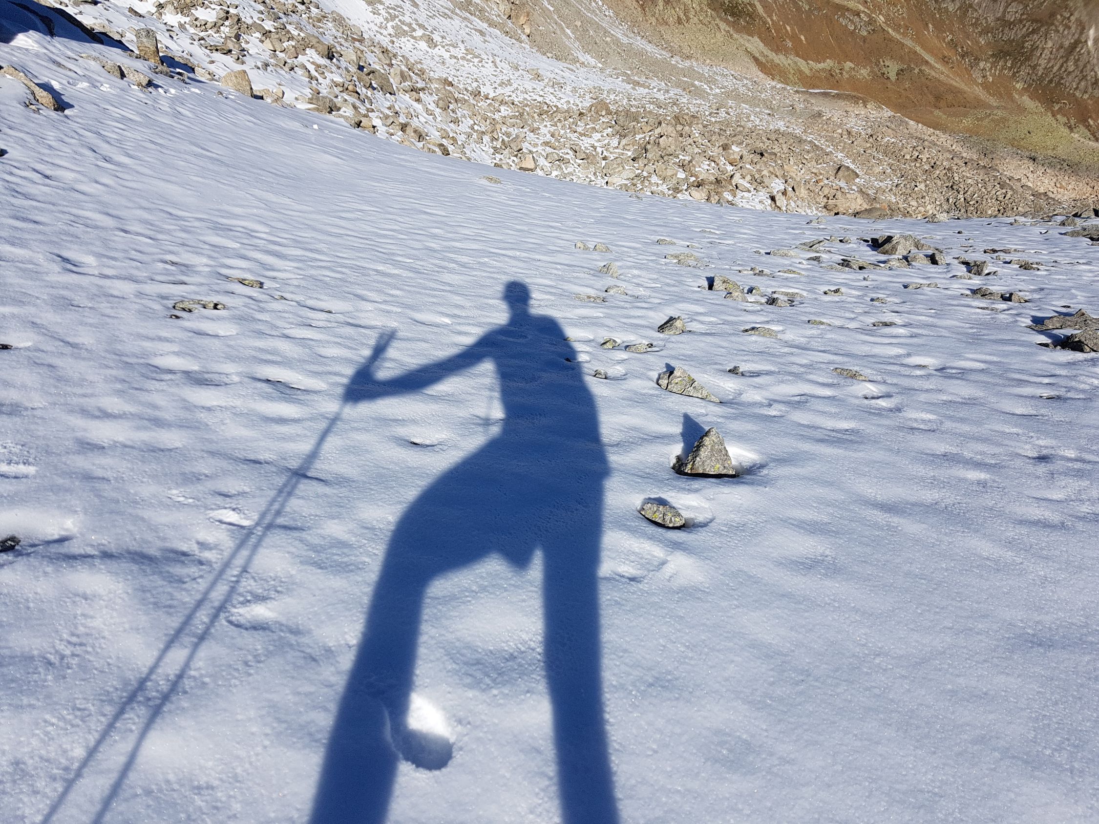 Nichts da, ich beisse die Zähne zusammen und kehre etwas demotiviert um. Ich muss wohl oder übel irgendwo hinab in die eklige schattige schneegefüllte N-Flanke.