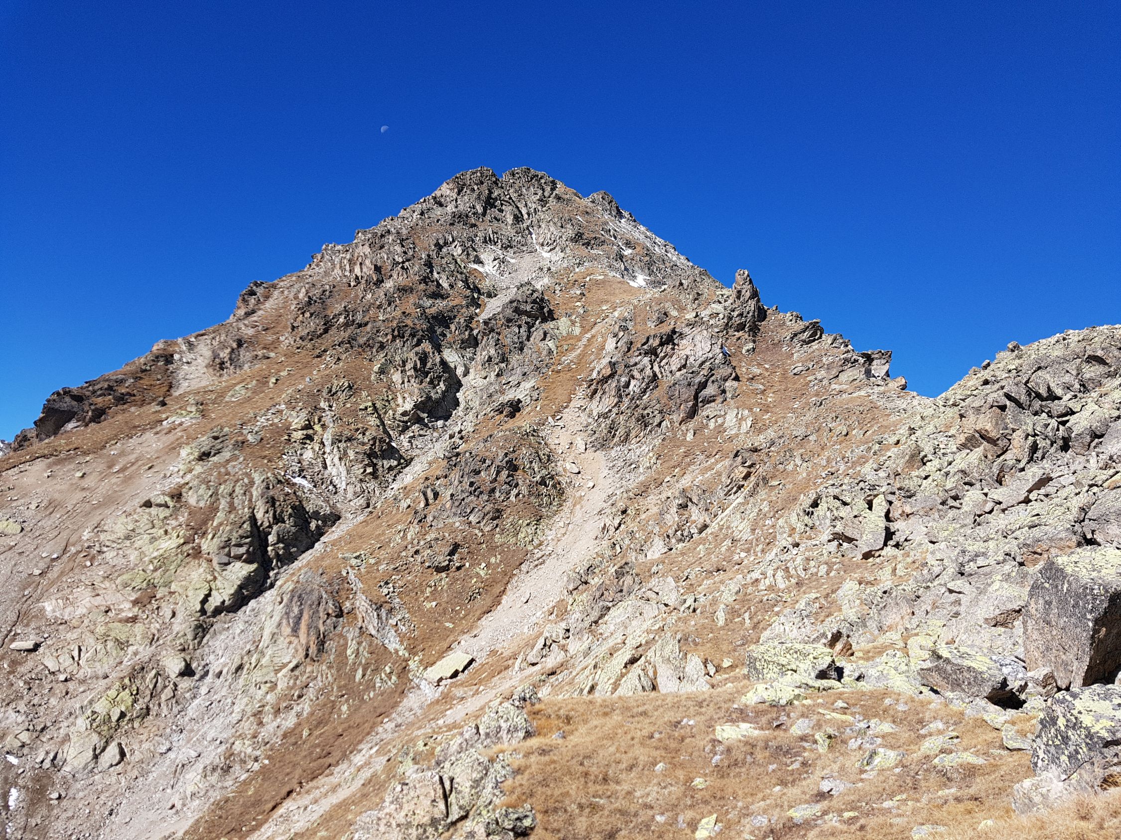 Nach vielen Fluchen und Durchhaltewille erreiche ich mit nassen Füssen wieder den Grat bei P2855. Nun traversiere ich scharf südlich vom E-Grat eine Tierspur und bei ca. 2900Hm steige ich wieder zum Grat hoch (T4+). Ab hier ohne nennenswerte Schwierigkeiten über Schrofen steil weiter hoch zum Piz Viluoch mit Steinmann (T4) ohne Gipfelbuch.