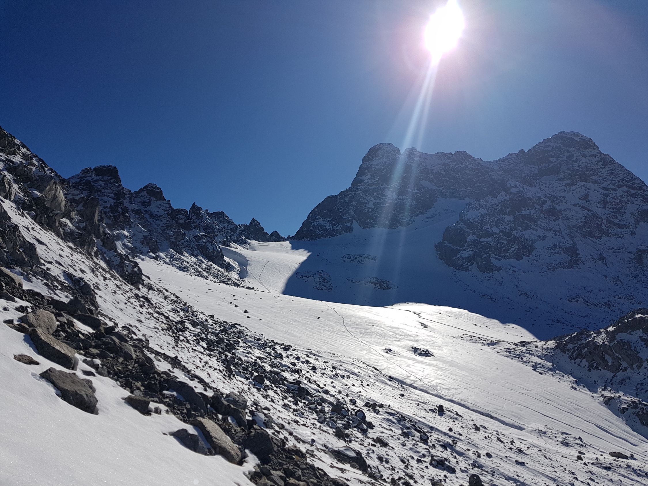 Meine Vermutung, dass der S-Grat aper und einfacher sein soll, war goldrichtig. Der S-Abstieg ist auch dank dem erdigen Schutt deutlich einfacher zu begehen (T4). Mittig hilft das sandige Kies die Knie entwas zu schonen. Unten auf dem Vadret Viluoch hat es keine Spuren vorhanden. Oben hat es ein paar grosse Gletscherspalten, weiter unten sieht alles gut eingeschneit aus. Ich wage es und traversiere den Gletscher am unteren Ende. Hier ist wieder mühsames Spuren angesagt. Der Übergang im Schutt und Kies zum Vadret da Porschabella ist einfach zu erreichen. Ich freue mich die vorhandene Autobahnspur der Piz Kesch-Aspiranten zu benutzen und komme so wie in einem Lift kräfteschonend hoch zur Porta d’Es-cha, wo am Schluss an den Felsen ein paar Ketten gesichert sind. Auch der steile und kurze SE-Abstieg im Hartschnee ist dank den Ketten gut zu meistern. Bis P2935 hat es weiterhin eine gute Spur im Schnee, danach ist das Gelände wieder aper.