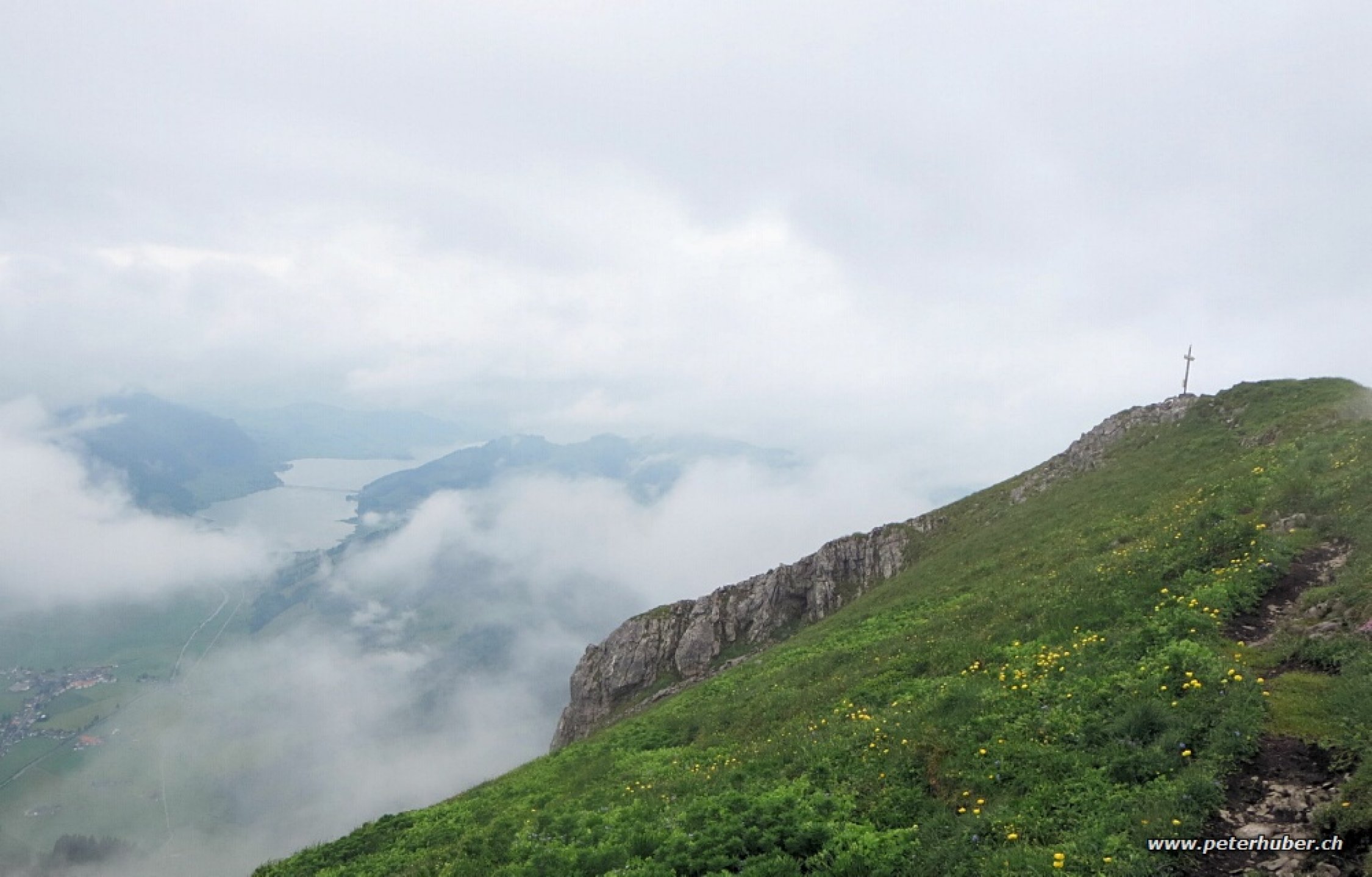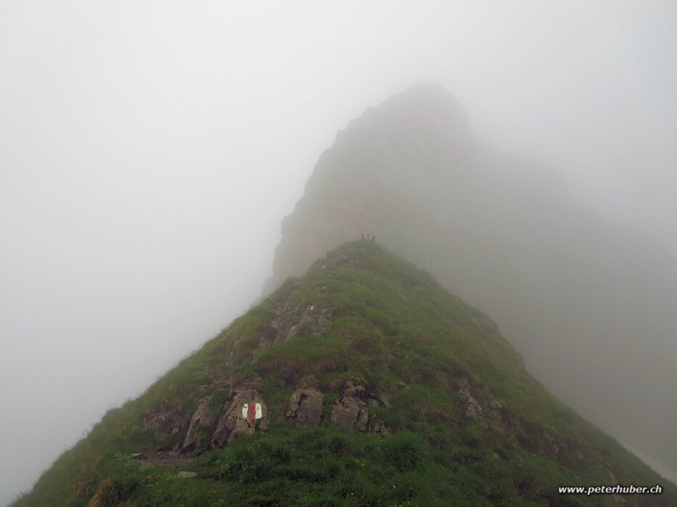 Oft leicher Regen, neblig, windig und kühl. Der Aufstieg vom Ochsenbodenn war ganz OK. Die Ketten am Grat waren recht kalt. Der Gipfel war in Nebel eingehüllt, nur kurz gab es einmal eine Aufhellung mit Sicht zum Sihl- und Wägitalersee.